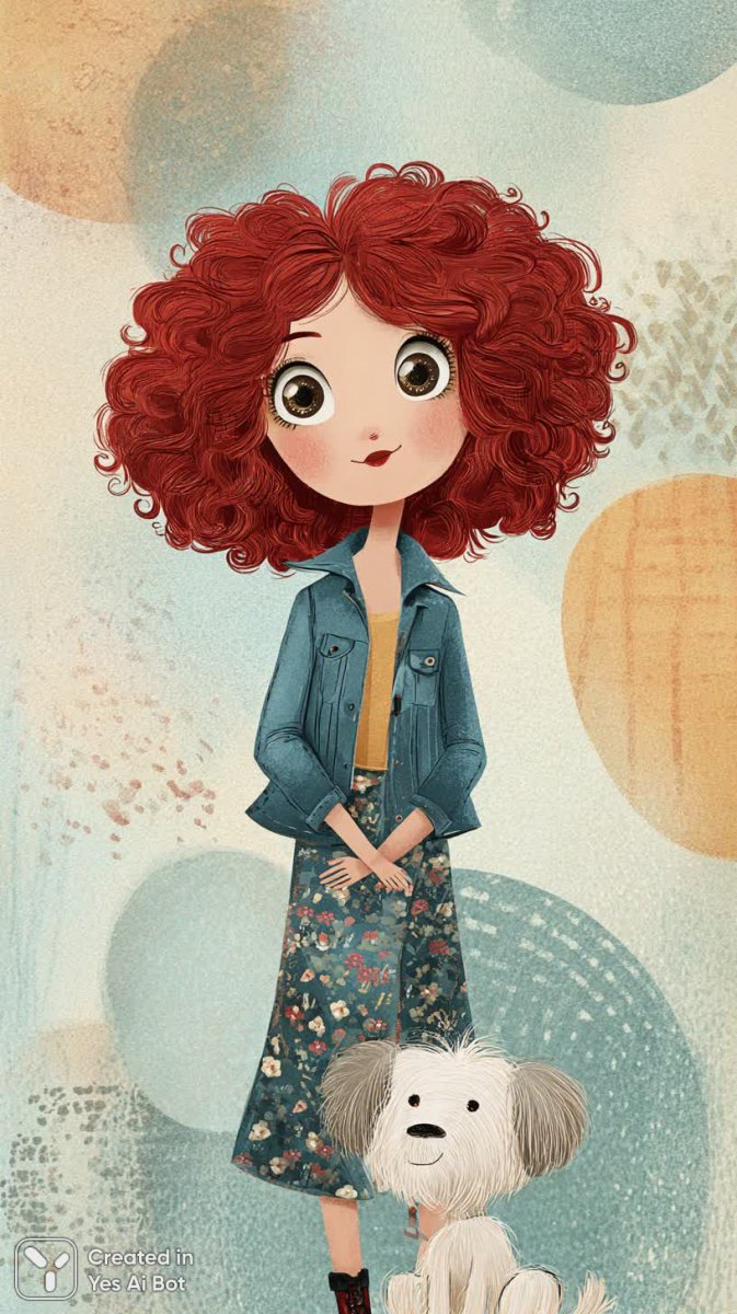 cartoon girl with short curly red hair, large expressive eyes, wearing a sunflower patterned dress, light denim jacket, petting a small fluffy dog with a cheerful expression, pastel-colored background with soft clouds, warm lighting, playful doll style, full body.