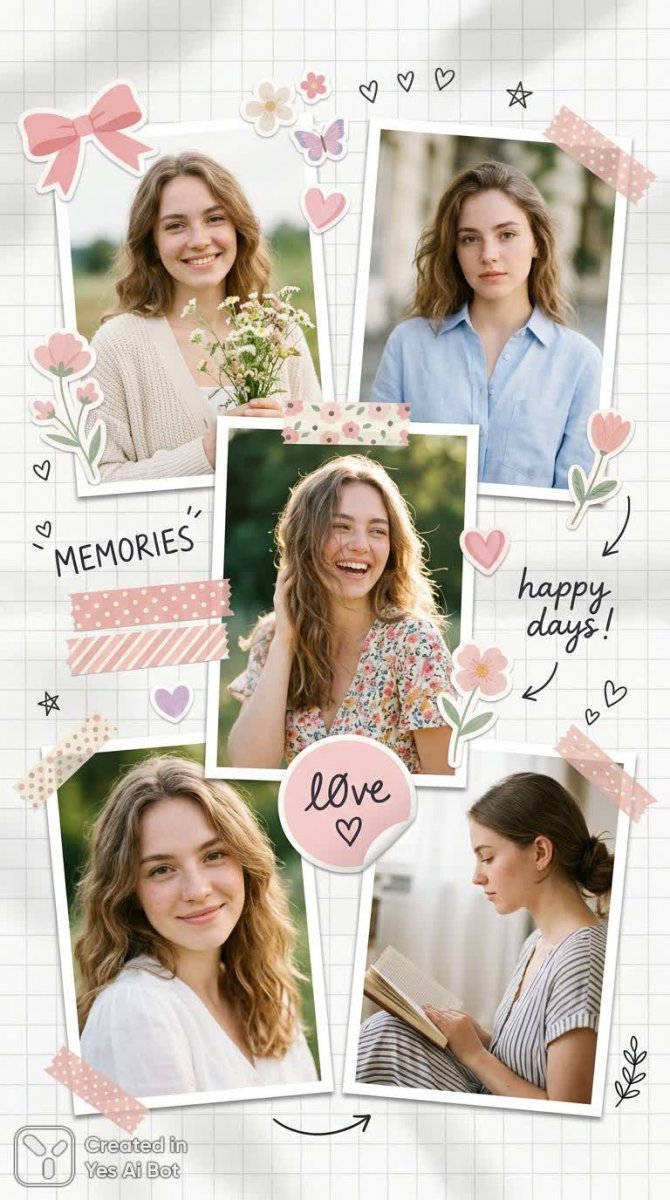 ultra high quality, dreamy scrapbook collage aesthetic, 5 photos of the same young woman, consistent face identity, sharp details, soft colors, smooth realistic skin texture, multiple poses and angles, accurate facial features, clean cut-out photo edges, arranged on white grid notebook-style bg, soft paper shadows, decorated with pastel scrapbook stickers: bows, flowers, hearts, butterflies, paper tape, handwritten doodles, pinterest-style moodboard, romantic pastel tones, feminine elegant style, soft natural daylight, mood is creative and youthful, "l0ve" handwritten text on a cute sticker, clean composition