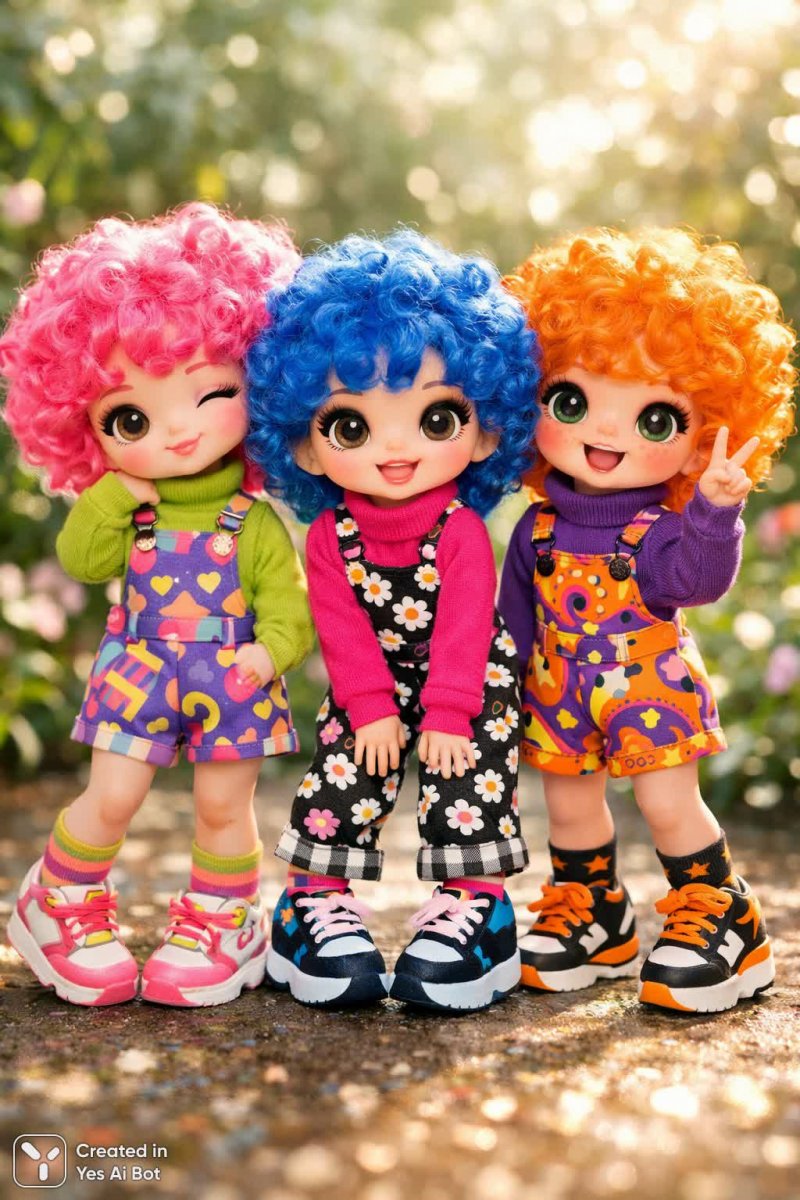 three cute dolls with large heads, bright curly hair in bold colors, patterned overalls and turtlenecks, pairing funky patterned socks with stylish sneakers, joyful poses, standing close together, soft blurred garden BG, soft shimmering light, vibrant illustration style.