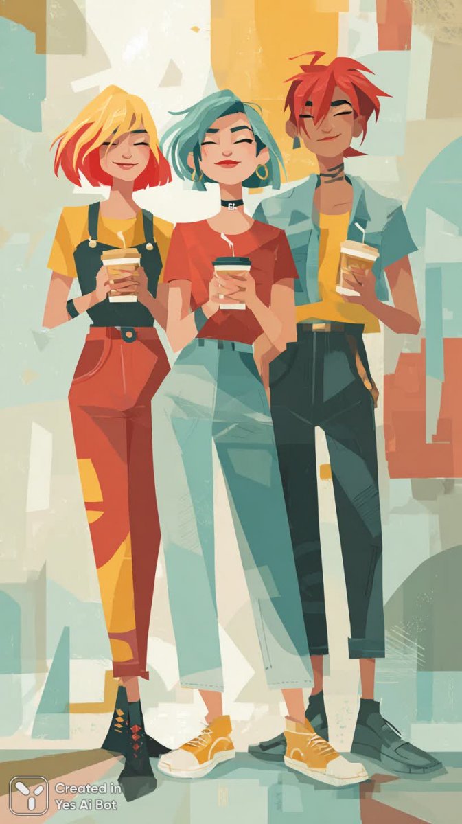 three trendy characters, bob hairstyles in bright colors, stylish graphic tees, high-waisted jeans, standing together with coffee cups, playful smiles, light urban backdrop, casual vibe, soft focus, contemporary art style.