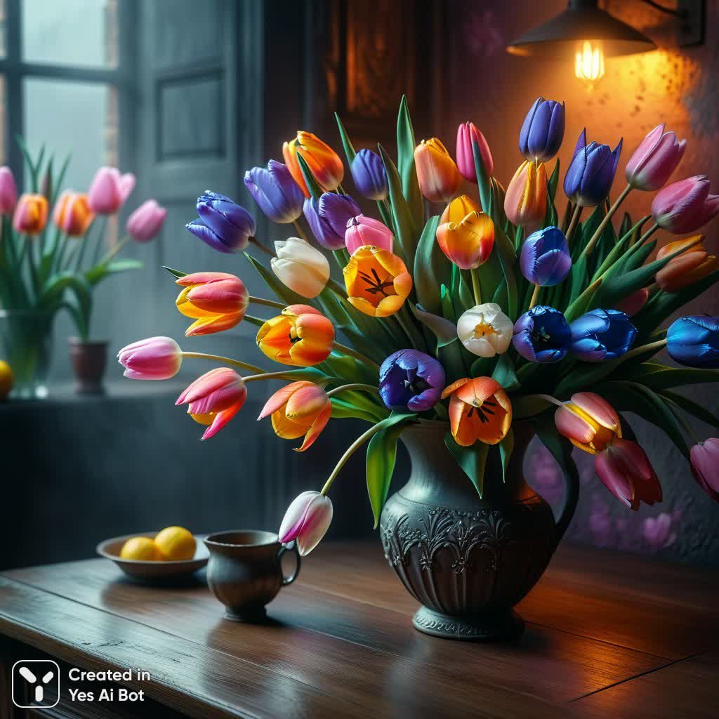 stable diffusion Нежная пастельная феерия: букет маттиол и тюльпанов в стиле сфумато. Изображение из нейронной сети Stable Diffusion