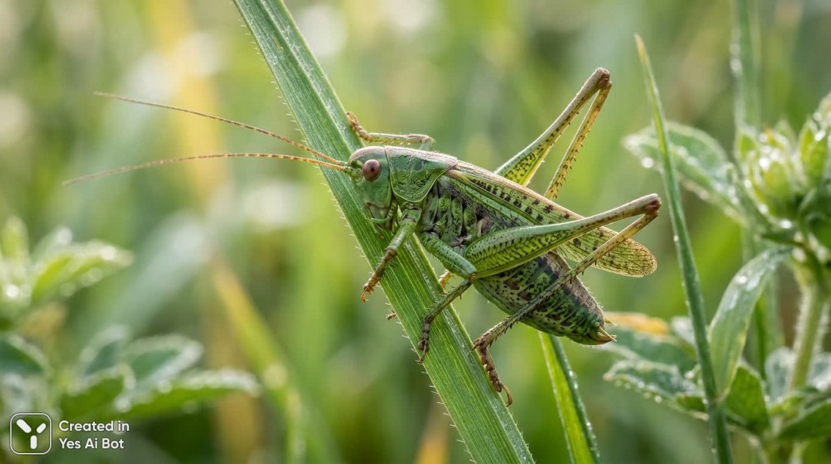 nanobanana Изучение природы: макросъемка зеленого кузнечика на травинке с детализацией текстур и узоров. Нейронная сеть Нано Банана
