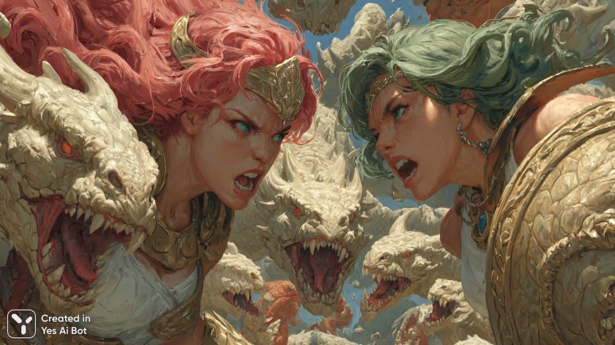 Битва воительниц против многоголовых драконов в эпическом фэнтези мире. Генерация из нейронной сети Миджорни