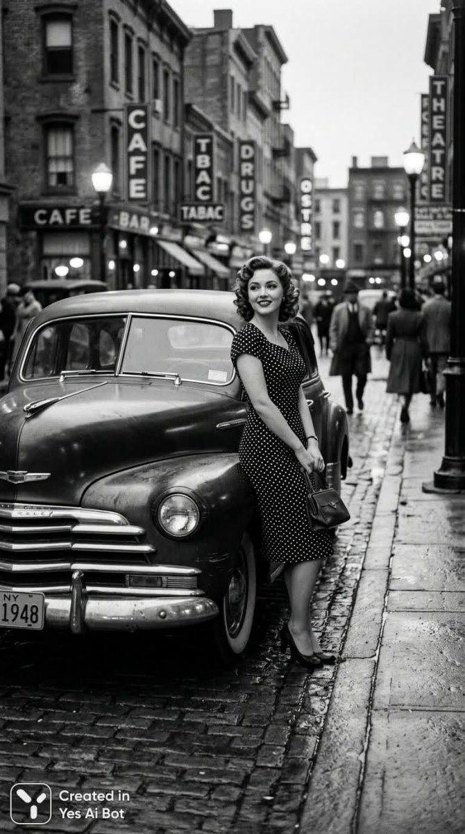 Восхитительное черно-белое фото в стиле ретро, переносящее зрителя в эпоху элегантности и утонченности. На снимке запечатлена молодая женщина с безупречной прической в виде винтажных локонов и классическим макияжем, подчеркивающим ее естественную красоту. Она одета в очаровательное платье в горошек, являющееся неотъемлемой частью ретро-образа. Рядом с ней стоит старинный автомобиль, добавляющий снимку атмосферу ностальгии и романтики. Городская улица служит фоном для этой неподдельной сцены из прошлого, создавая ощущение ушедшей эпохи. Мягкая зернистость придает фотографии особый шарм и винтажный колорит, подчеркивая ее художественную ценность. Вся композиция пронизана атмосферой воспоминаний, вызывая легкую грусть и восхищение красотой простых вещей. Этот снимок – настоящая ода ретро-стилю, запечатлевшая мгновение времени в вечном черно-белом формате. Он словно приглашает зрителя окунуться в мир элегантности, стиля и незабываемых воспоминаний, пробуждая чувства ностальгии и тепла. Фотография излучает спокойствие и умиротворение, предлагая зрителю передохнуть от суеты современной жизни и насладиться красотой простоты и гармонии