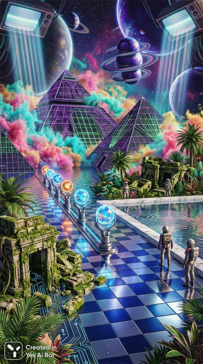 Завораживающий пейзаж, сотканный из тропических руин и футуристического великолепия. Хромированные шахматные плиты простираются под ногами, уводя взгляд к небесам, где парят пирамиды, окутанные разноцветными облаками, словно воплощенной музыкой или символами. Величественные планеты-диски мерцают фиолетовым светом, создавая ощущение неземного пространства. В центре композиции – зеркальный бассейн из мрамора, в котором отражается все это великолепие и зарождается влияние ослепительно серебристых барбосов. Искры света переливаются рядом с мерцающим кассетным смертным миром, а нисходящие лучи старого телевизора добавляют ретро-ностальгию в этот сюрреалистический ландшафт. Кажется, что над руинами возвышается канал, увенчанный светящимися сферами, удерживающими статуи – посланники из другого измерения. Это симфония света и тени, древности и современности, хаоса и порядка, где реальность смешивается с фантазией в невероятном вихре красок и форм, вызывающем глубокие размышления о времени, пространстве и сущности бытия. Здесь переплетаются мифы прошлого и технологии будущего, создавая неповторимое зрелище, которое захватывает дух своей красотой и загадочностью