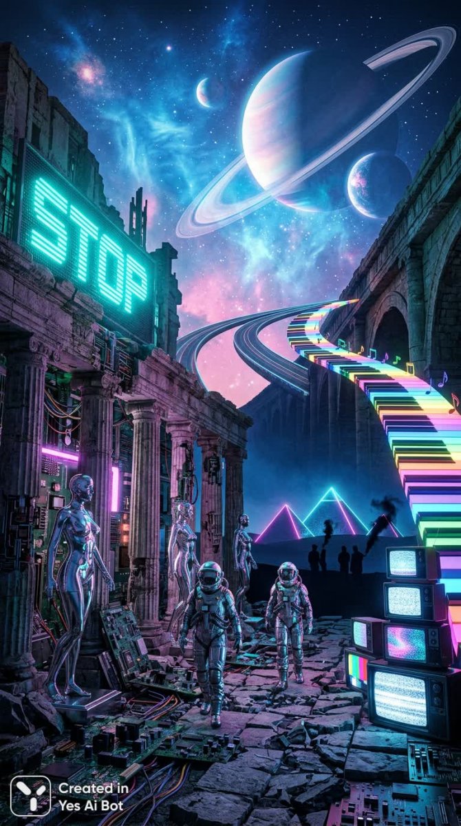 Завораживающий пейзаж, сотканный из элементов научной фантастики и ретро-футуризма. Хромированные статуи величественно возвышаются среди руин сложной электронной схемы, будто застывшие стражи забытой эпохи. Огромные планеты, словно потерянные в пространстве маяки, медленно дрейфуют над винтажными телевизорами, создавая сюрреалистический контраст между древним и современным. Вдали простирается космическая магистраль, уходящая к горизонту, где каменный мост плавно растворяется в психоделических абстрактных клавишах пианино – метафорическое соединение материального мира с безграничным пространством музыки и воображения. Воздух пронизан нежным сине-розовым дымкой, характерной для эстетики вейперпанк, добавляя сцене ощущение загадочности и нереальности. Среди этого фантастического окружения можно увидеть фигуры людей в блестящих металлических скафандрах – исследователей неизведанного или, возможно, беглецов из параллельной реальности. Пирамиды, сияющие своим таинственным светом, выглядывают из-за силуэтов курящих фигур, добавляя сцене нотку древней мистики и человеческой слабости. Яркий неоновый текст цвета аквамарина, отчетливо гласящий 'STOP', привлекает внимание, словно предостережение или призыв к размышлению. Всё это представлено в высоком разрешении с цифровой эстетикой HD, создавая впечатление гиперреалистичности и погружая зрителя в мир, где границы между реальностью и воображением стираются. Это картина, которая одновременно завораживает своей красотой и заставляет задуматься о природе времени, пространства и человеческого существования