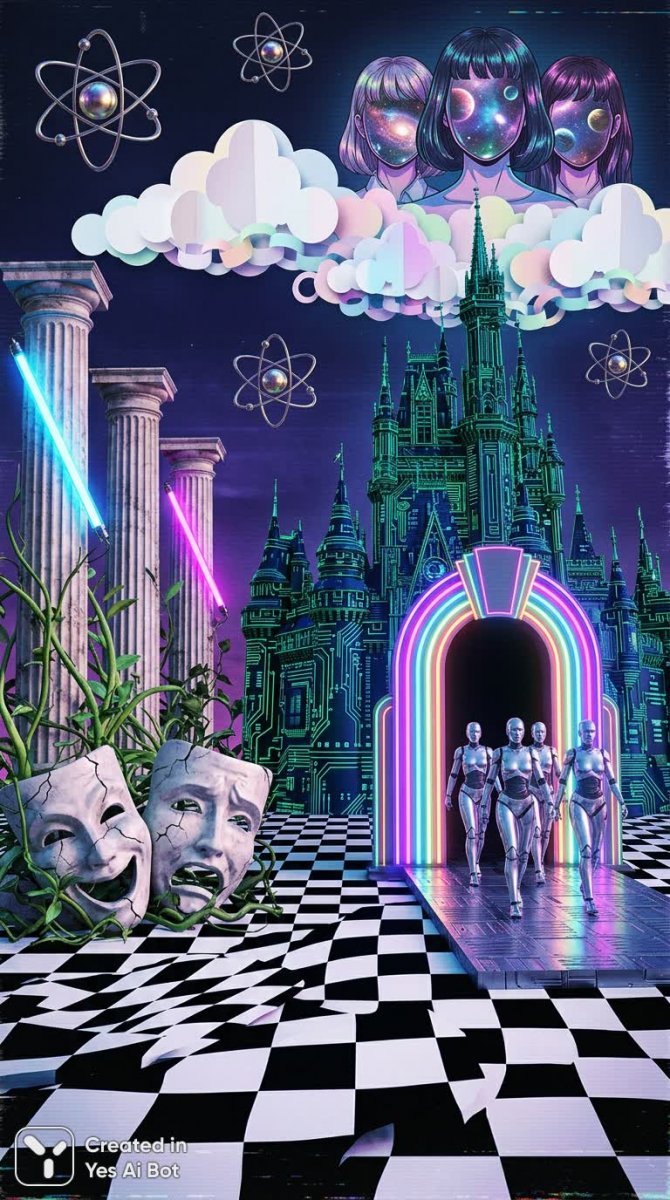 Изображение представляет собой сюрреалистический коллаж, где элементы реального мира и футуристические конструкции объединяются в причудливой композиции. Основа – шахматный узор из черного цвета, на котором возвышается замок, стилизованный под печатную плату. Вдалеке виден портал, освещенный неоновыми огнями радуги, сквозь который видны серебристые роботы, напоминающие солдат. Рядом с замком растут растения, лежат треснувшие театральные маски и стоят статуи в стиле Vogue из мрамора, подсвеченные флуоресцентным светом. В небе плывут облака из бумажных цепочек под изображениями девушек, лица которых отражают поверхности далеких планет. В воздухе парят атомы в стиле ар-деко. Общая атмосфера пронизана эффектом цифрового искажения и дрожащего пара. Каждое изображение переплетается с технологическими деталями, создавая пространство, полное символизма и загадок. Композиция передает ощущение дежавю, напоминая о сновидении или цифровой иллюзии, сочетая в себе кибернетические, футуристические и ретро-кибер стили. Изображение создано нейронной сетью Nano Banana v.2.0.