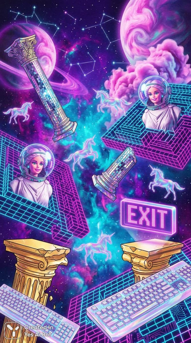 Завораживающий неоновый лабиринт, сотканный из причудливых конструкций и мерцающих элементов. Внутри этого фантастического пространства парят диско-шары, а древние колонны, словно рушащиеся во времени, устремляются в бездонную космическую пустоту. Воздушное царство населяют единороги, а среди застывших статуй можно разглядеть лица Барби, облаченные в кислородные шлемы – странные и трогательные символы современной эпохи. Небо над этим сюрреалистическим миром завораживает гигантскими клубами дыма и розовыми парами, создавая ощущение неземной красоты и опасности одновременно. Вдалеке мерцает текст 'EXIT', написанный яркими буквами, словно манящий к спасению или новой реальности. Сломанные золотые пьедесталы сменились жемчужными клавиатурами – метафорой перехода от классической эстетики к цифровому миру. Вся эта картина разворачивается под сиянием звездного неба, создавая впечатление космического путешествия. Визуальный фон представляет собой искаженную галактику в стиле поп-арта, напоминающую о ярких и запоминающихся образах 80-х годов. Это сложный, многогранный образ, сочетающий в себе элементы научной фантастики, ретро-эстетики и сюрреализма, погружающий зрителя в мир глитч-арт и цифровой красоты, где прошлое и будущее переплетаются в причудливом танце. Изображение вызывает ощущение ностальгии, одновременно завораживая своей новизной и непредсказуемостью