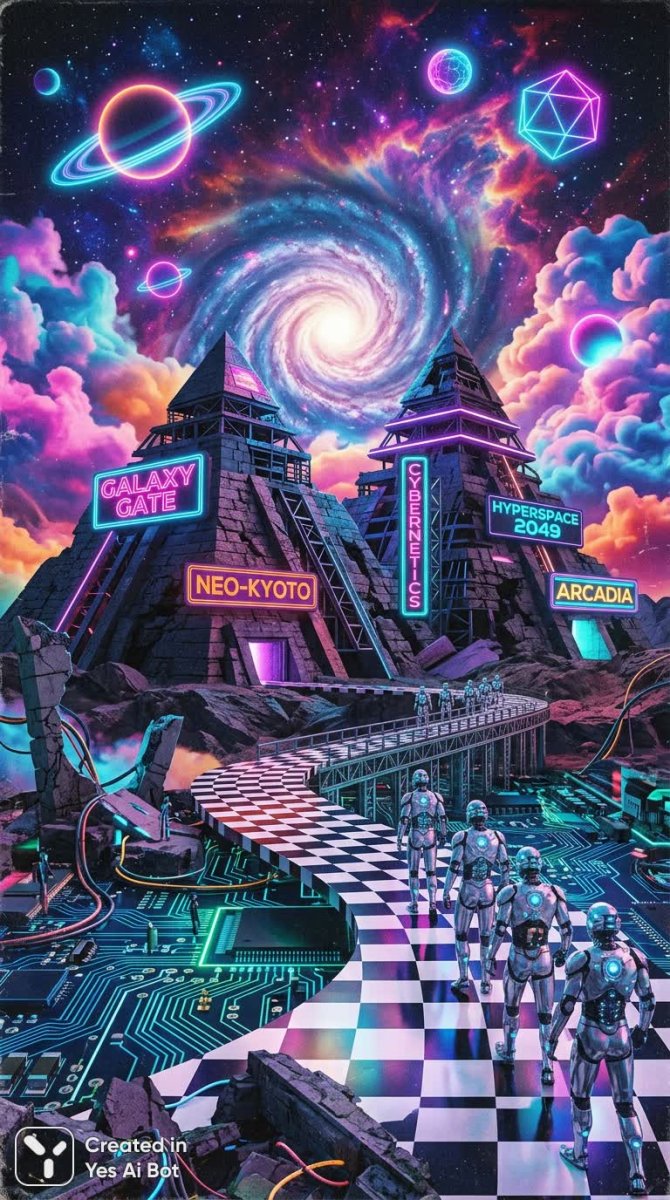 Завораживающее полотно, сотканное из фрагментов сновидений и отголосков ушедшего будущего. Перед зрителем предстают руины древних пирамид, окутанные дымкой ретро-футуризма, где черно-белая шахматная плитка простирается под светом пульсирующих неоновых планет. Над этой призрачной местностью клубится небо, трансформированное в цифровые ландшафты из печатных плат, создавая ощущение нереальности и технологической магии. Серебристовооруженные фигуры людей уверенно движутся по мосту, ведущему к мерцающему порталу, открывающему врата в бескрайние галактики. Пастельные тона вапорейва переплетаются с яркими неоновыми вывесками стиля синтвейв, создавая гипнотическую атмосферу ностальгии и цифрового экстаза. Это визуальный манифест эпохи, где прошлое встречается с будущим, а реальность растворяется в потоке пикселей и света. Картина пробуждает чувства удивления и таинственности, приглашая зрителя погрузиться в мир, где границы между мирами стираются, и воображение становится единственным проводником. Это путешествие сквозь пространство и время, воплощенное в сюрреалистической фотоколлаже, полном символов и метафор, ожидающих своего толкования. Здесь каждый элемент несет свою смысловую нагрузку, создавая сложную и многогранную картину, которая заставляет задуматься о природе реальности и месте человека во вселенной