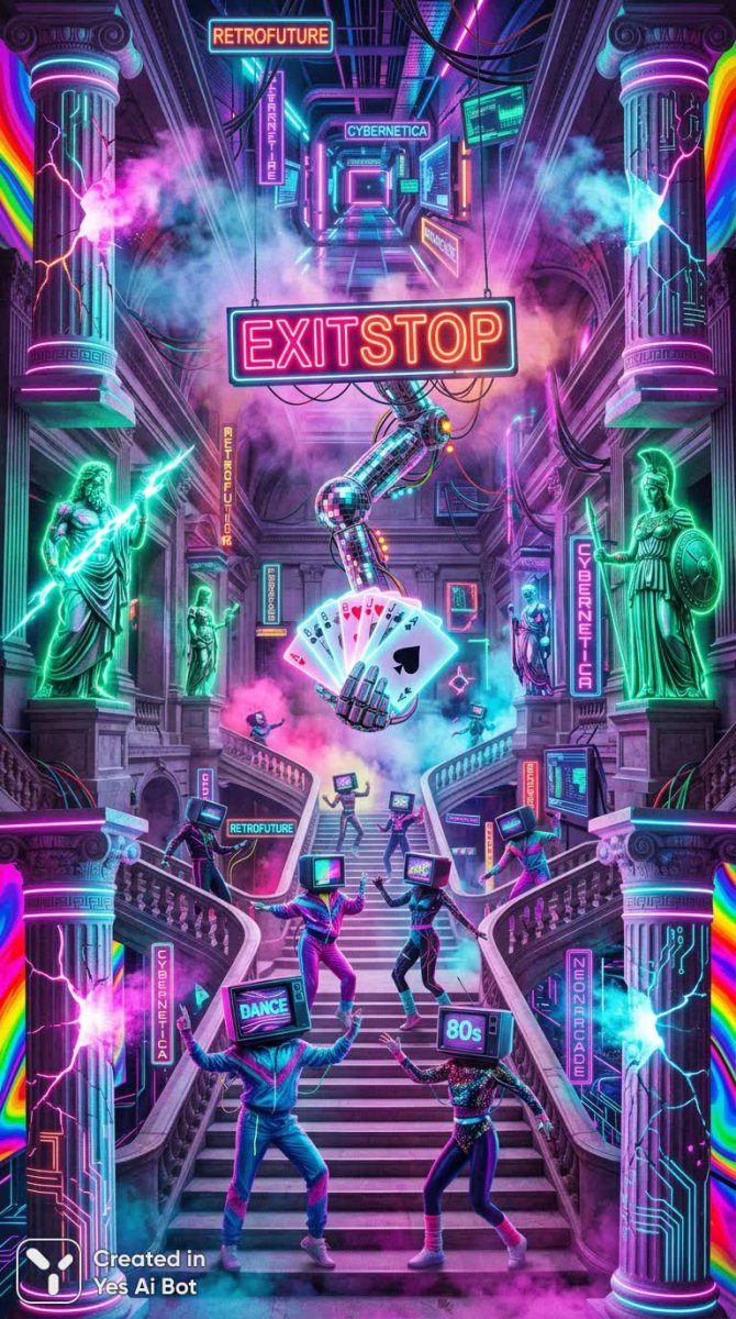Яркая и хаотичная сцена в стиле поп-арт, вдохновленная эстетикой 80-х годов, захватывает воображение своим безудержным визуальным потоком. В центре композиции – танцующие неоновые фигуры, чьи головы заменены экранами телевизоров, создавая сюрреалистичный и запоминающийся образ. Они словно ожившие символы эпохи, воплощающие дух перемен и технологического прогресса. Длинный коридор с величественной лестницей в стиле паллацо служит фоном для этого фантасмагорического действа, добавляя ощущение глубины и перспективы. Вдоль стен возвышаются колонны в стиле вейпорвейв, которые разветвляются во множестве направлений, создавая иллюзию бесконечности и дезориентации. Неожиданным дополнением к этой яркой картине являются фигуры изумрудных греческих богов, словно сошедшие со страниц мифологии и органично вписавшиеся в современный контекст. Воздух пронизан дымом, сквозь который проглядывают светящиеся надписи EXIT/STOP, добавляющие тревожный оттенок в общее ощущение праздника. Завершающим штрихом становится рука, держащая диско-шар и карты для игры, символизирующая случайность, удачу и азарт. Трещины на колоннах пропускают сквозь себя яркие лучи света, создавая радужные фоны, усиливающие ощущение нереальности происходящего и погружающие зрителя в мир грез и фантазий. Эта сцена – настоящий визуальный коктейль, сочетающий в себе элементы ретро-футуризма, поп-культуры и мифологии, создавая уникальное и запоминающееся впечатление. Кажется, будто попадаешь внутрь ожившей видеоигры или музыкального клипа, где реальность переплетается с фантазией, а прошлое встречается с будущим
