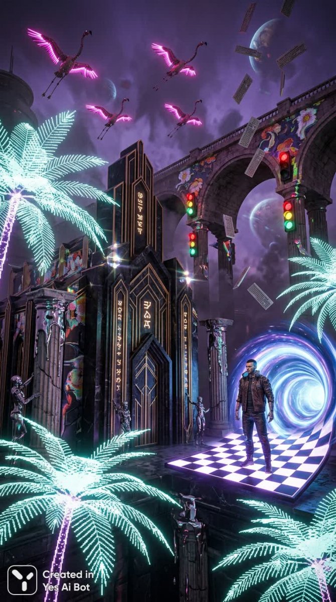 Скрытая за хаотичным великолепием цифровых пальм, возвышается арт-деко часовня инопланетян, словно мираж в сюрреалистическом пейзаже. Над ней простираются смолистые пурпурные небеса, из которых, подобно взрыву цвета, вылетают футуристические фламинго, смешиваясь с разбросанными клавишами компьютерных клавиатур – символом столкновения аналогового и цифрового миров. В центре композиции – фигура человека, непропорционально увеличенная, задумчиво стоящая на шахматной доске, словно готовящаяся к вечному ходу в безграничный портал. Вокруг нее медленно, с едва заметным скрипом, двигаются хромированные статуи, просачиваясь сквозь древние колонны, изборожденные временем и трещинами. Над всем этим доминирует жесткая структура светофоров – остановка и движение – возвышающихся над каменным мостом, который склоняется под тяжестью космических планет, парящих в вышине. Вся эта причудливая сцена пронизана ностальгическими элементами винтажного диско, создающими своеобразную космическую структуру и обеспечивающими гармонию хаоса. Природные узоры искажены до неузнаваемости в безумии реального пара, превращаясь в психоделический танец форм и цветов, который захватывает воображение и погружает зрителя в мир фантастических образов и бесконечных возможностей. Этот шедевр представляет собой визуальную оду технологическому прогрессу, переплетенную с отголосками прошлого, создавая уникальный и незабываемый опыт