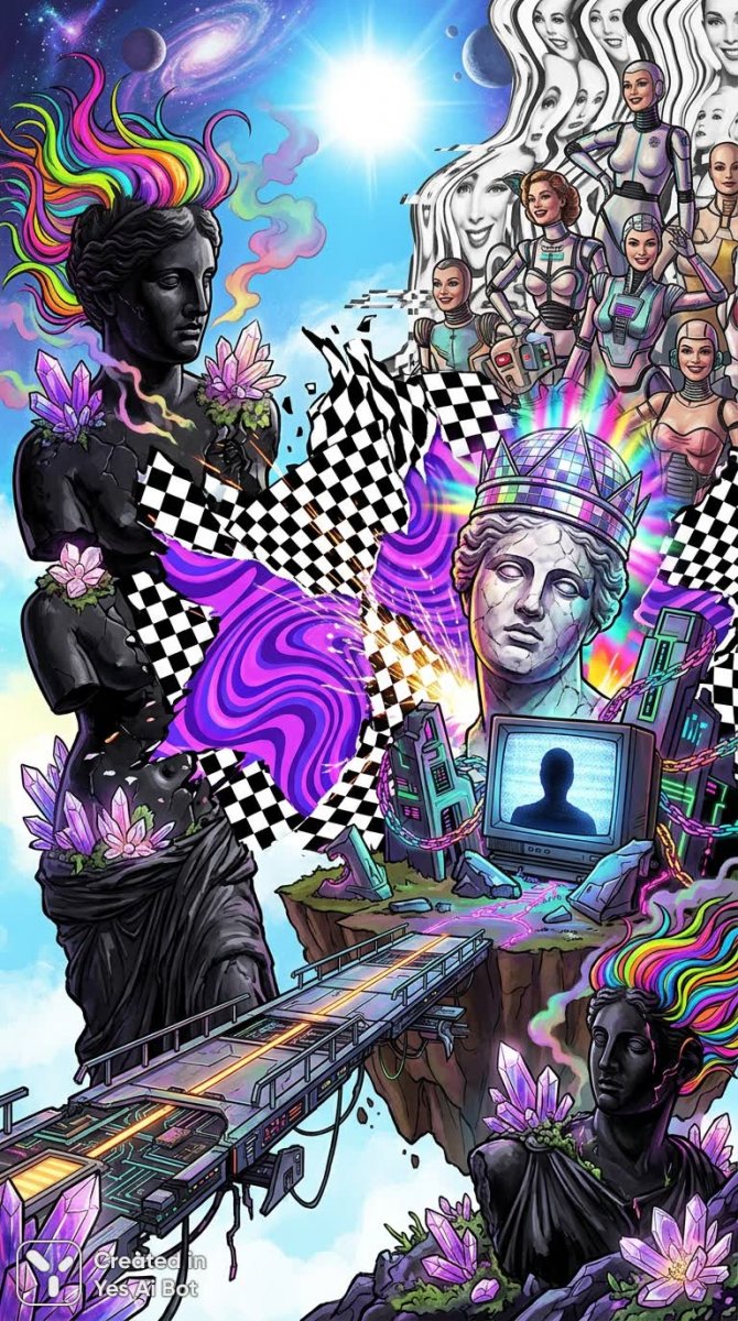 Изображение демонстрирует постапокалиптический пейзаж заброшенного космического острова, где руины высокоразвитых технологий соседствуют с причудливой, сюрреалистической красотой. Энергичные клетчатые узоры резко контрастируют с яркими лилово-фиолетовыми волнами в стиле Lisa Frank, создавая ощущение хаотичной энергии и ностальгии. В композиции гармонично сочетаются элементы античности – черные греческие статуи, над которыми вырастают абстрактные радужные волосы – и футуристичные конструкции из светодиодной архитектуры и мерцающих цепей.