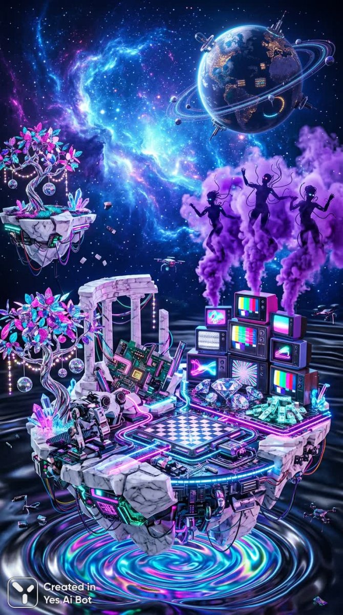 Завораживающий и сюрреалистичный пейзаж, где реальность переплетается с фантазией, создавая неповторимую атмосферу. Невероятный вид на фрагментированные мраморные острова, плавно поднимающиеся из-под огромной завершенной футуристической планеты, освещенной мягким сиянием голубого космического туманного образования. Встречаются причудливые деревья в стиле Барби и Лиза Франк, добавляющие яркости и беззаботности в это фантастическое место. Хаотичные печатные платы преобразуют руины, расположенные над элегантным хромированным бассейном, создавая ощущение технологического прогресса и разрушения одновременно. Шахматные доски плавно перетекают в мерцающий глянцевый ретро-телевизор, окруженный силуэтами фиолетового дыма. Роскошь подчеркивают скульптуры из денег и бриллиантов, символизирующие богатство и успех. Вся картина пронизана деталями диско-культуры, добавляющими динамичности и блеска этому неземному миру. Это визуальное путешествие в глубины подсознания, где возможно все, а границы между реальностью и мечтой стираются безвозвратно. Ощущение волшебства и таинственности пронизывает каждый элемент этого необыкновенного пейзажа, приглашая зрителя погрузиться в мир фантазий и открытий
