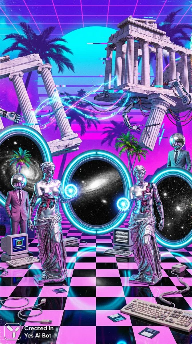 Завораживающая гиперреалистичная коллаж-композиция, где древность и футуризм переплетаются в причудливом танце. Величественные греческие колонны возвышаются над обломками древних руин, парящих над ярким шахматным полом. Вся сцена пронизана эстетикой vaporwave с неон-фиолетовыми небесами, создающими атмосферу ностальгии и цифровой мечты. Экзотические пальмы неожиданно соседствуют с головами диско-шаров, усиливая ощущение сюрреалистичности и безудержного веселья 80-х. В композиции присутствуют статуи из сплавленного серебра, грациозно удерживающие светящиеся сферы – символ знания и прогресса. Рассыпанные по пространству компьютерные клавиатуры намекают на цифровой мир и его влияние на реальность. Неожиданными акцентами служат порталы, открывающиеся в черно-белое галактическое пространство, предлагающие зрителю заглянуть в бесконечность космоса. Общее впечатление – это всплеск энергии 80-х, пропитанный духом поп-арта и переосмысленный через призму современных цифровых технологий. Изображение представляет собой визуальную симфонию контрастов: древние руины и футуристические порталы, классическая архитектура и неоновые цвета, аналоговое прошлое и цифровое будущее. Это захватывающее путешествие в мир грез, где реальность искажается, а воображение обретает свободу. Каждая деталь коллажа тщательно проработана, создавая ощущение погружения в невероятную, но притягательную вселенную
