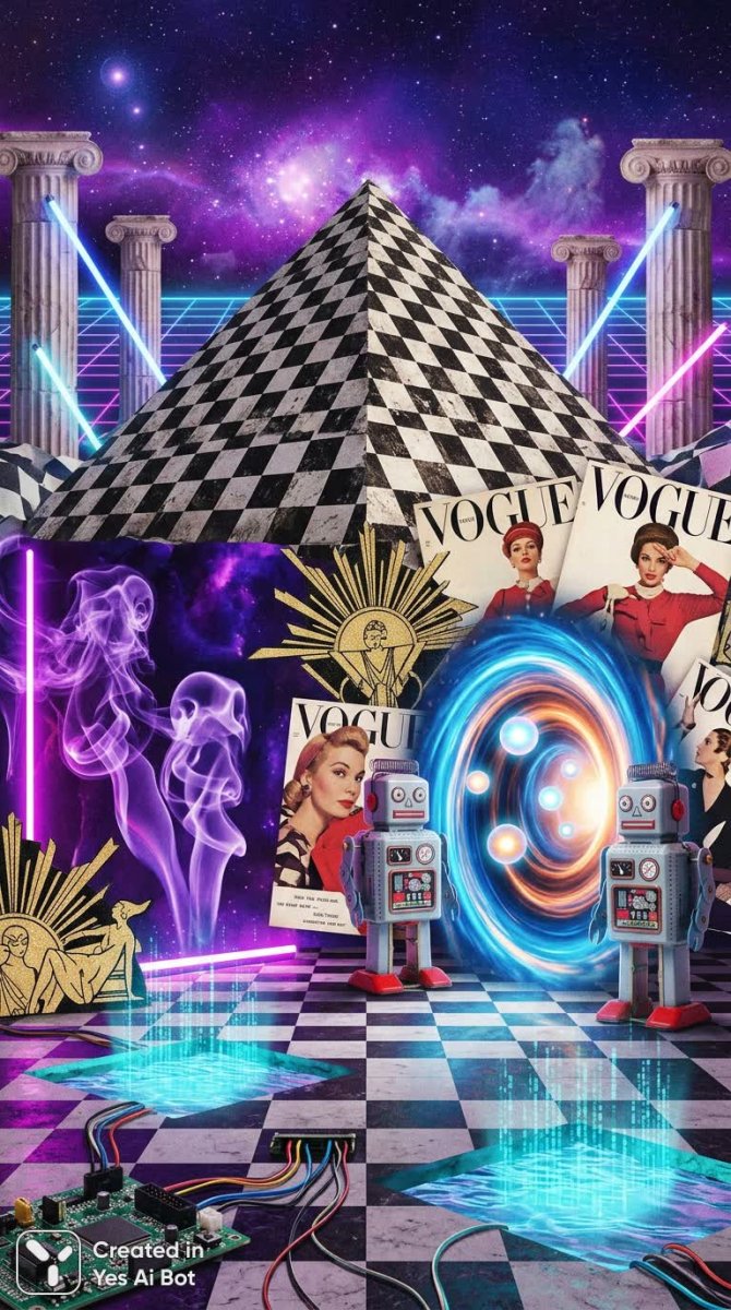 Завораживающая гиперреалистичная психоделическая коллаж погружает зрителя в мир сюрреалистических образов и неожиданных сочетаний. В центре композиции раскинулся древний черно-белый шахматный пол, словно портал в забытое прошлое. На его фоне возвышаются величественные пирамиды, гармонично интегрированные между мраморными колоннами в греческом стиле, создавая ощущение вечности и мощи. Яркие неоновые огни в духе вапорейва и вапорпанка добавляют динамики и футуристической энергии, контрастируя с классическими элементами архитектуры. Призрачные скульптуры из фиолетового дыма придают сцене таинственность и загадочность, словно шепот потусторонних сил. Ретро-роботы из серебристого металла стоят на страже под бескрайним звездным небом, олицетворяя симбиоз прошлого и будущего. Разбросанные страницы журнала Vogue создают эффект мозаики, а мерцающие порталы с сияющими сферами намекают на возможность перемещения между измерениями. Изящные элементы ар-деко в стиле плоских иллюстраций добавляют нотку элегантности и изысканности. Неожиданный акцент – искаженные печатные платы, выглядывающие из аквамариновых голографических бассейнов, символизируют технологический прогресс и цифровое пространство, переплетающиеся с реальным миром. Общий эффект - это визуально ошеломляющее произведение искусства, сочетающее в себе элементы разных эпох, стилей и культур, создавая уникальную и захватывающую атмосферу. Каждая деталь тщательно проработана, а цветовая палитра насыщена яркими и контрастными оттенками, что делает коллаж настоящим визуальным пиром для глаз. Это путешествие в мир фантазии и воображения, где реальность смешивается с иллюзией, а прошлое встречается с будущим