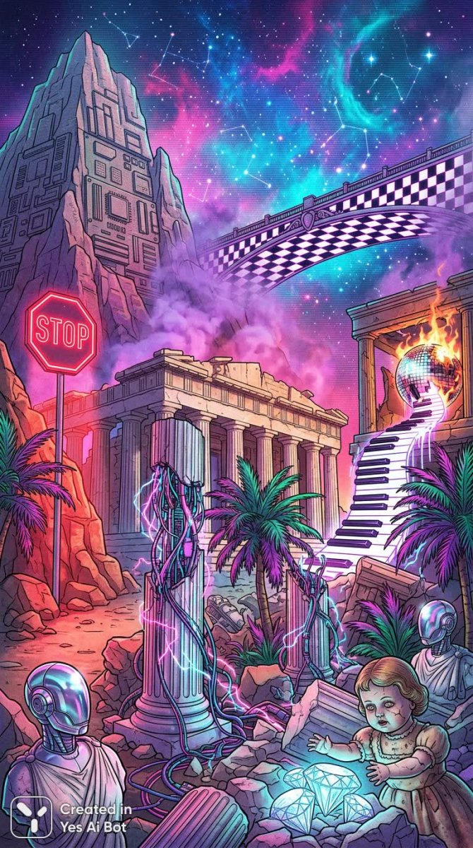 В сюрреалистичном изображении древние руины храма неожиданно сочетаются с современными технологиями: мраморные колонны переплетаются с электрическими проводами, создавая атмосферу разрушенной цивилизации, переосмысленной в цифровой эпохе. Яркие пальмы растут среди обломков статуй с хромированными головами, символизируя жизнь вопреки упадку. Стоп-знак подсвечивает основание горы, вырезанной из компьютера, подчеркивая столкновение реальности и виртуальности. Фиолетовый дым поднимается к шахматной мостике, ведущему в искрящийся небосвод вселенной, а потоки клавиш пианино перетекают над пылающими диско-шарами, создавая визуальную симфонию. Куклы с жадными конечностями тянутся к алмазным скульптурам, отражая стремление к недостижимому совершенству. Картина выполнена в стиле варпвейв и представляет собой цифровую живопись, сотканную из ярких цветов и неожиданных образов, погружающую зрителя в мир грез и технологической магии, где прошлое и будущее сливаются воедино, вызывая ностальгию по несуществующему будущему. Изображение создано нейросетью Nano Banana v.2.0 в стилях кибернетики, футуризма и ретрокиберпанка.