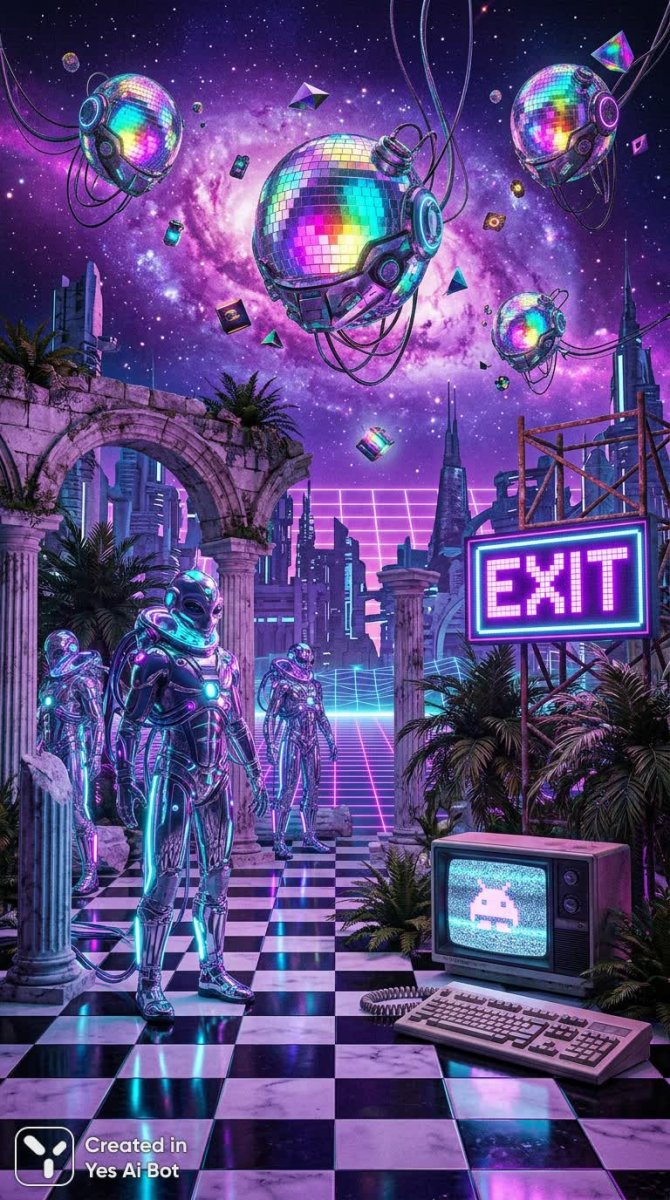 Завораживающая цифровая коллаж-иллюстрация в гиперреалистичном стиле переносит зрителя в сюрреалистичный мир, где прошлое встречается с будущим. Под ногами простирается шахматный пол, контрастирующий с сияющими статуями инопланетян, облаченных в хромированные костюмы, словно отражая свет фиолетовых галактических небес над головой. Разбросанные мраморные колонны и разрушенные каменные арки добавляют атмосферу древности и упадка, создавая ощущение заброшенного, но в то же время завораживающего пространства. В этом странном пейзаже соседствуют элементы ретро-технологий: старый телевизор и компьютерная клавиатура, неожиданно оказавшиеся среди тропических пальм. Яркая неоновая надпись EXIT в пиксельном исполнении намекает на необходимость покинуть это место, но притягивает взгляд своей стильной простотой. В воздухе парят головы диско-шаров, переливающиеся всеми цветами спектра, создавая ощущение праздника и футуристической роскоши, а руины научно-фантастических конструкций подчеркивают контраст между разрушением и прогрессом. Вся композиция пронизана эстетикой вейпорвейва, сочетая в себе элементы 80-х годов и ретро-футуризма. Кажется, будто художник воссоздал забытое будущее, где технологии и природа, прошлое и настоящее сплетаются в единое целое, создавая неповторимую атмосферу ностальгии и загадочности. Это визуальное путешествие в мир грёз, где реальность искажается, а воображение обретает свободу, предлагая зрителю задуматься о природе времени и технологического прогресса. Картина представляет собой уникальный сплав эстетики диско, научной фантастики и цифрового искусства