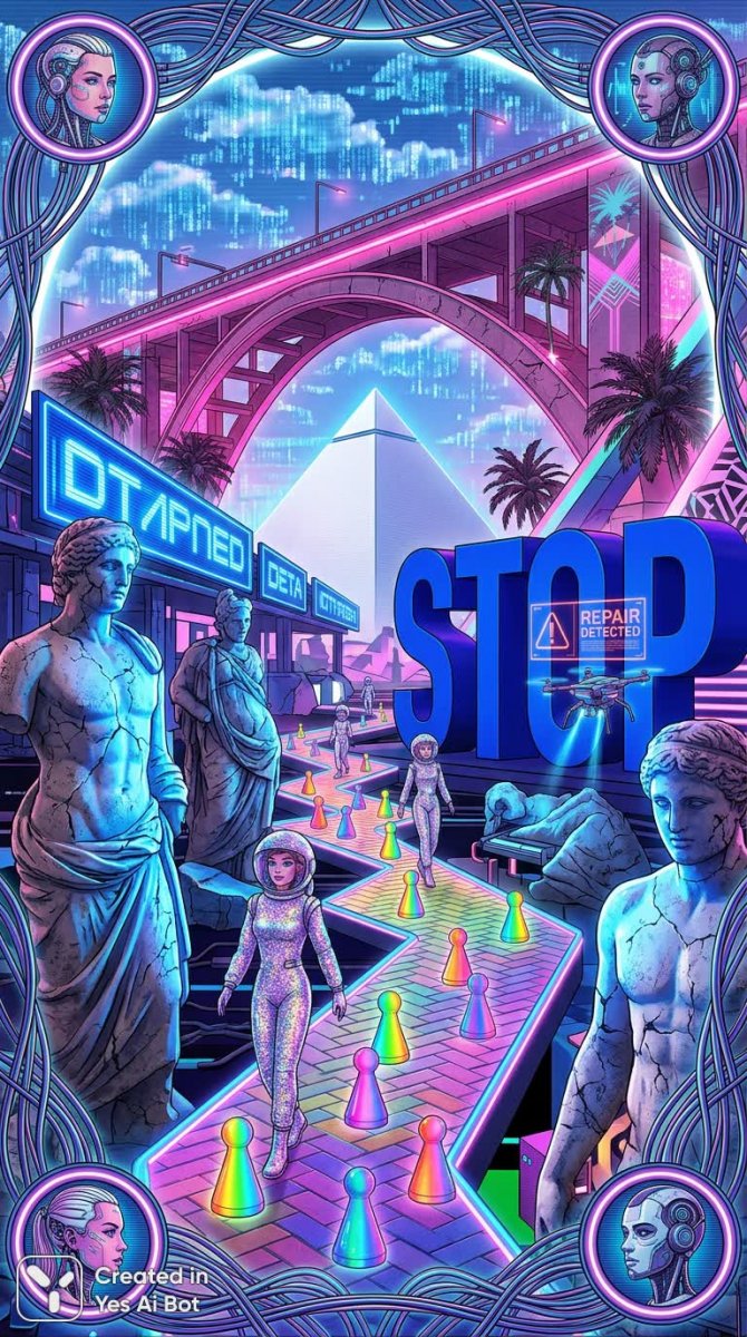 Сюрреалистичный коллаж, сотканный из фрагментов реальности и фантазий, погружает зрителя в мир цифрового нео-нуара. Трещины на древних статуях контрастируют с ярким сиянием голубого неона, создавая ощущение вечной трансформации. Загадочные куклы, облаченные в сверкающие скафандры, словно инопланетные посланники, уверенно движутся по радужной шахматной тропе, ведущей в неизвестность. Над классической белой пирамидой, паря над пейзажем, простираются цифровые облака, а вокруг неё расцветает розовый тропический лес, освещенный космическими оттенками. Впечатляющая конструкция в стиле vaporwave и cyberpunk соединяет фрагменты мира, образуя мост между прошлым и будущим. Яркая сапфировая скульптура с надписью 'STOP' приковывает внимание, намекая на необходимость остановиться и задуматься о происходящем. Визуальный хаос дополняется петляющими проводами, окруженными короной энергии, и портретами на краю сцены, создавая ощущение многослойности и глубины. Качество изображения поражает своей детализацией и ослепительным блеском, захватывая воображение и приглашая к исследованию этого удивительного мира цифрового искусства, где реальность искажается и переплетается с мечтами. Это визуальный гимн современному искусству, сочетающий в себе ностальгию по классике и смелые эксперименты с цифровыми технологиями