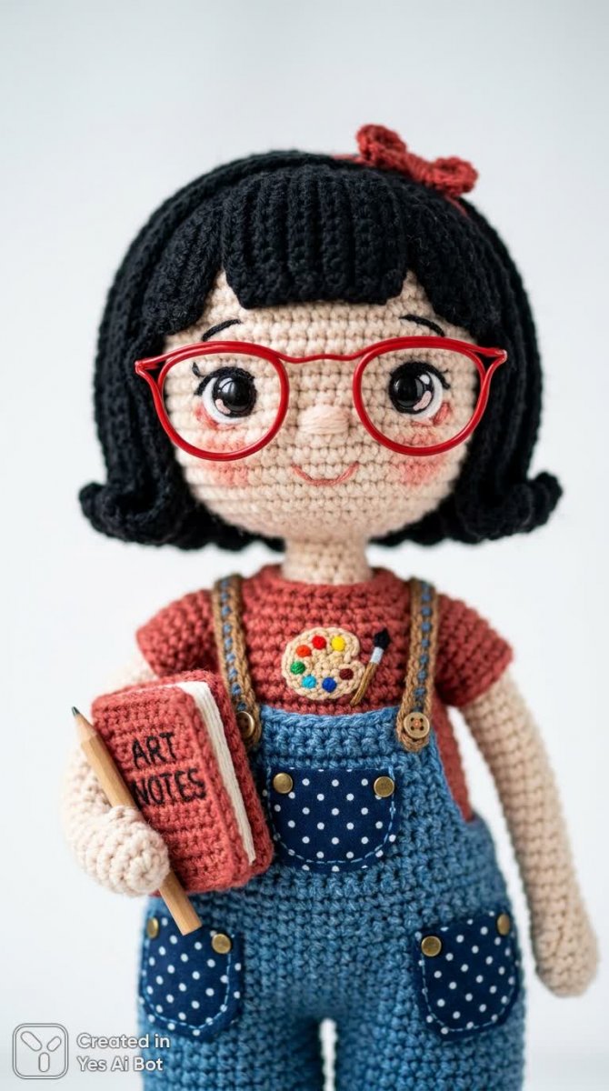 crocheted doll with jet-black bob hairstyle, bold red glasses perched askew, wearing retro-themed overalls, tiny blue polka dot pockets, mushroom-red T-shirt with artist’s palette – detail close-up on facial features, doll holding matching yarn-red mini sketchbook, white BG, high-quality, highlighting the whimsical face and cosplay attitude.