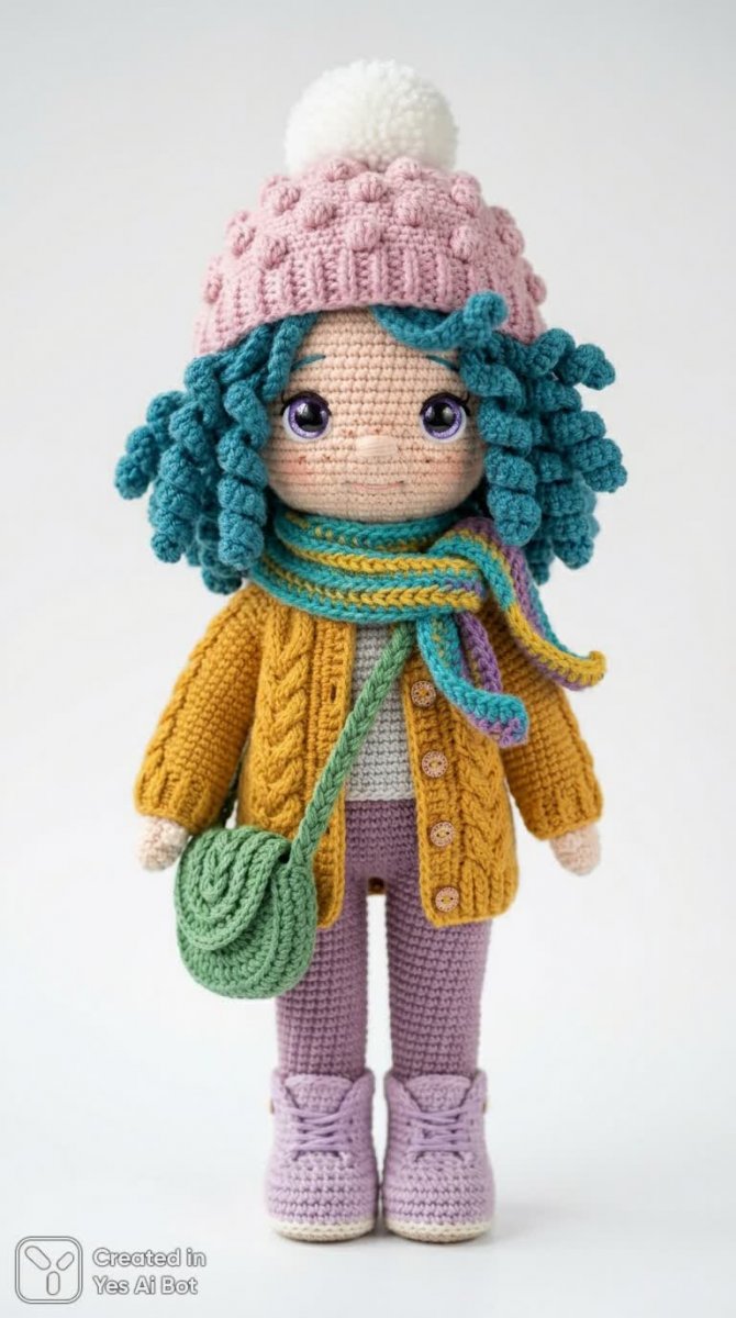 crocheted doll with teal curly hair, round face and sparkling violet eyes, tiny freckles across nose, sporting yellow cable-knitted cardigan, snug light pink beanie hat with a white pompom, matching striped leggings and lavender boots, white BG, braided green handbag, high-quality, soft lighting, vibrant crochet scarf loosely tied.
