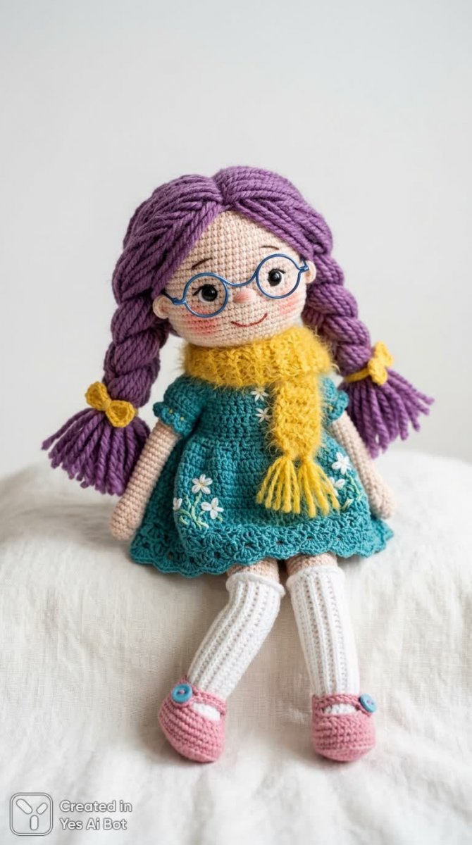 crocheted doll with short purple hair, round face, blue glasses sitting slightly crooked, sporting teal dress with fluffy yellow scarf, high white socks, pink shoes with blue buttons, BG is plain white, high-quality, soft lighting, focusing on cozy charm and fun accessories of outfit.