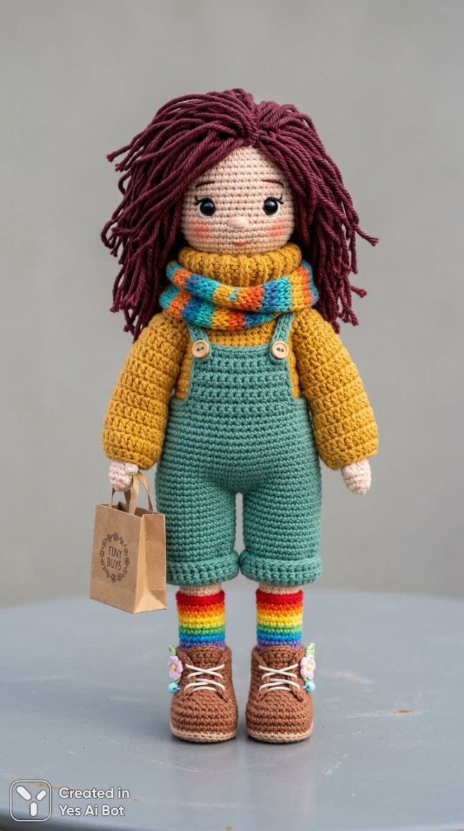 crocheted doll with dark maroon hair tied in colorful scarf, oversized yellow turtleneck sweater, sea-green overalls, holding tiny shopping bag, striped rainbow socks and brown ankle boots with pastel decorations, upright on neutral gray bg, high-quality bright lighting, showing creative style and crocket shades.