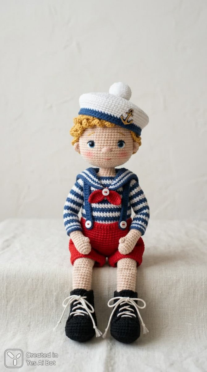 crocheted doll in classic sailor outfit, striped blue and white top, tiny white bell hat, red shorts with suspenders and white button, black boots loosely laced, short golden hair tucked under hat, BG is plain, high-quality, soft lighting, highlighting nautical details and crochet stitches.