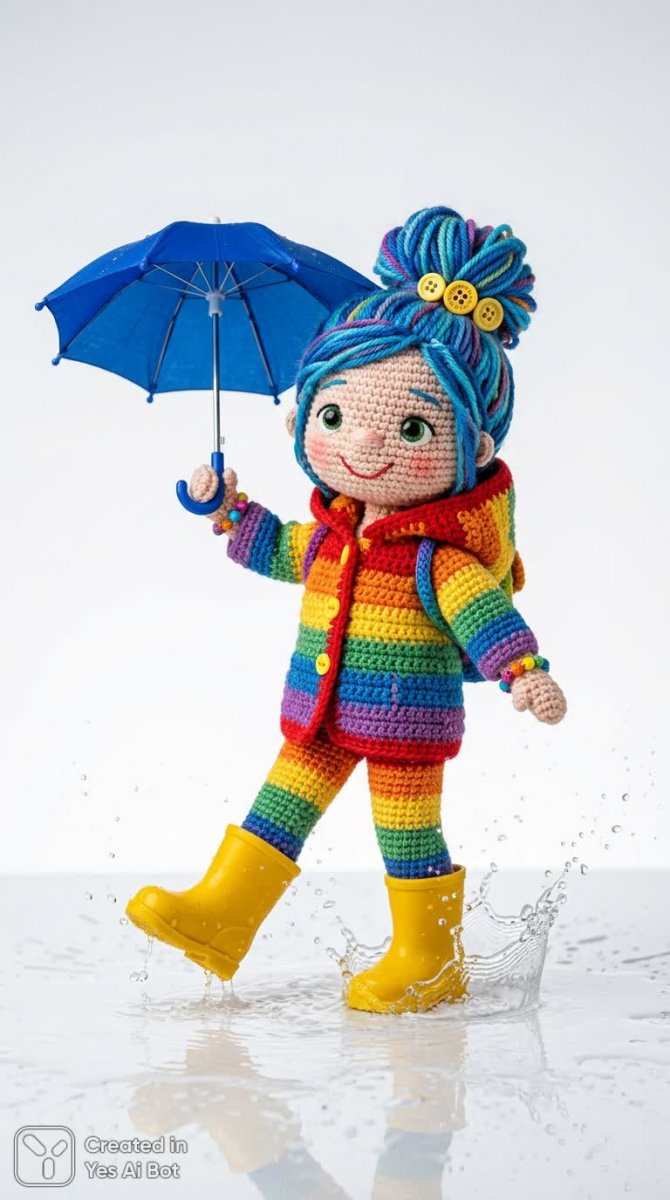 nanobanana Забавная вязаная кукла в радужной дождевой одежде и резиновых сапогах под кобальтовым зонтом. Картинка из нейронной сети NanoBanana
