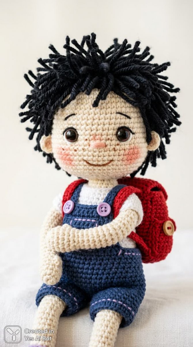 Эта милая вязаная кукла, выполненная в сочетании техник вязания крючком и спицами, демонстрирует уникальный стиль и внимание к деталям. У нее дерзкие черные игловидные волосы, которые контрастируют с нежной одеждой: темно-синим комбинезоном, застегнутым лиловыми пуговицами, и белоснежной рубашкой под ним. Акцент сделан на милом образе благодаря круглым щекам и аккуратно вышитым веснушкам. Маленький красный рюкзак добавляет элемент приключений и динамики. Изображение выполнено в максимальном гипертактильном фокусе, позволяющем рассмотреть все детали, включая текстуру вязания и игру дизайнерских элементов. Фон нейтральный - белый – что позволяет выделить куклу как главный объект внимания. Мягкое освещение подчеркивает нежность материалов и создает ощущение уюта и тепла, делая куклу идеальным подарком для любителей рукоделия и коллекционеров hand-made игрушек, способным подарить радость и вдохновение. Изображение создано нейросетью Nano Banana v.2.0 в стилях реализма и детализации.