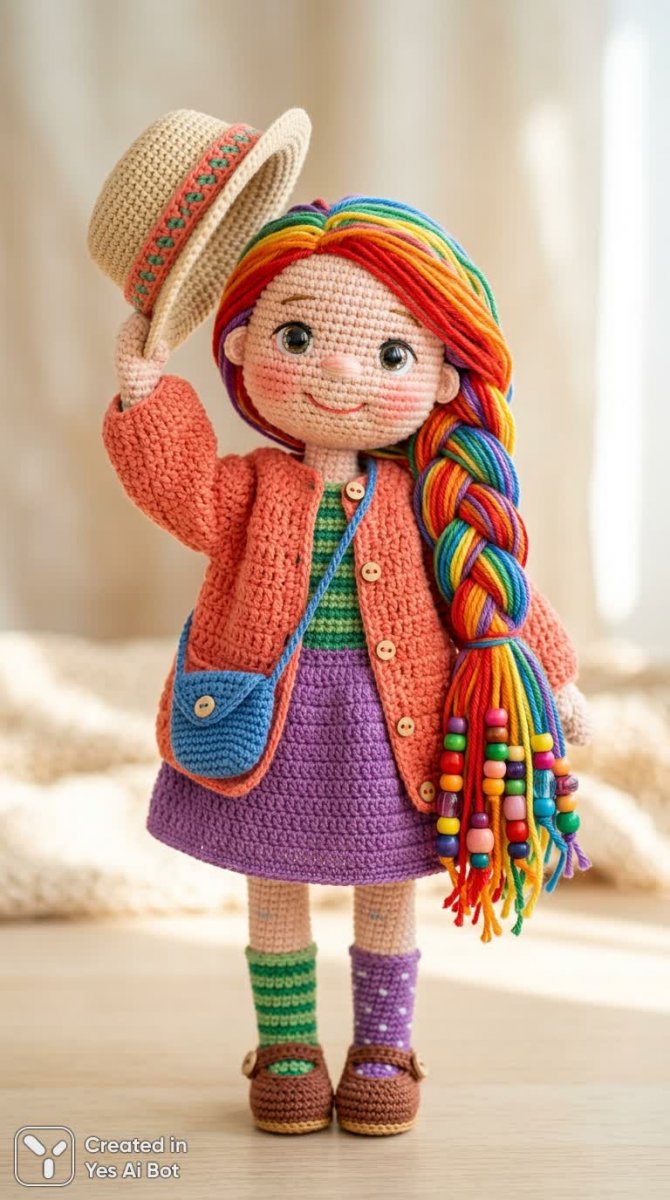 crocheted doll with vibrant rainbow braid, mismatched green and purple leggings under oversized coral sweater, tiny blue purse slung across body, rosy cheeks and big sparkling eyes, allows ponytail beads to cascade over shoulder, posed joyfully holding hat in hand, soft plain background, brightly-lit image.
