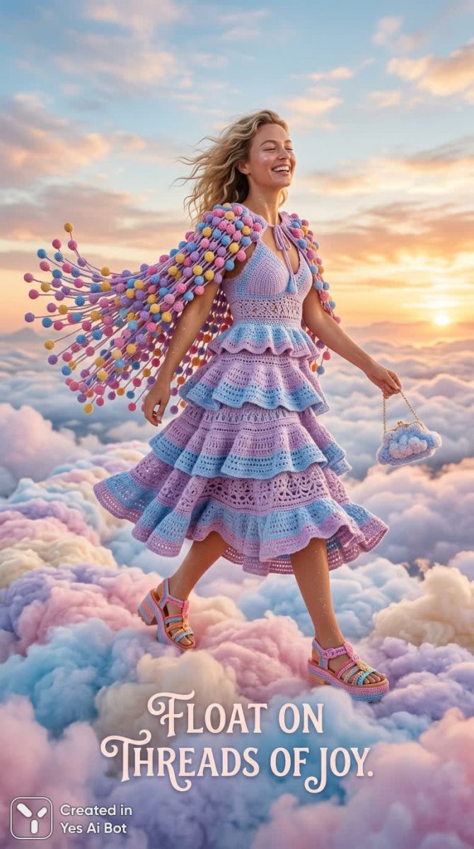 runway-ready woman on pastel clouds, flirty tiered ruffle dress constructed of soft lilac and baby blue crochet, detachable ball fringe cape fluttering dramatically, tall platform jelly-sandals crocheted in candy colors, tiny cloud-formed purse in hand, SPF glitter skin, dreamy euphoric facial expression, pledge at feet: “float on threads of joy.”