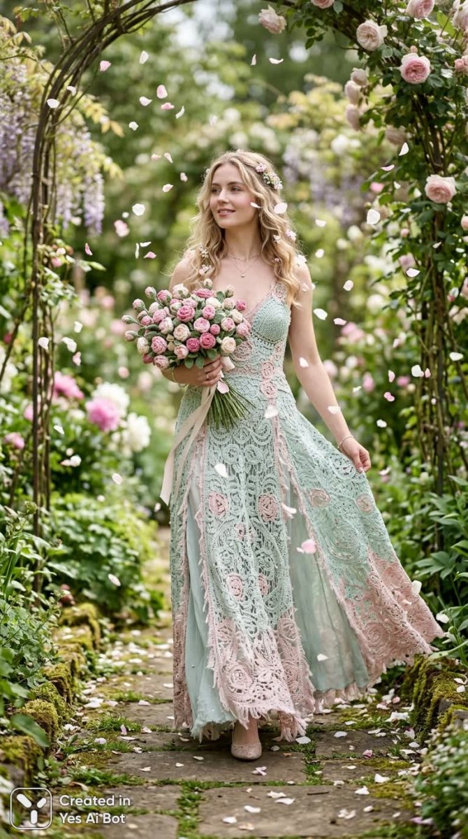 soft romance: verdant garden daylight, delicate burnout-hems crocheted spring gown in mint and blush hues, flowing silhouettes adorned with fine baguette beading, armful of miniature crocheted rosebuds, flowing time with petals, creative cloudlike setting, serene daydream in style harmony