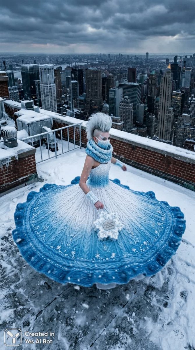 Впечатляющий образ зимней королевы на фоне заснеженной крыши города. Высокая модель с дерзным мохом кружится в вихре снега, демонстрируя роскошное платье оперного покроя длиной в пол. Невероятный градиент от белого к синему выполнен из вязаного крючком полотна и украшен тысячами сверкающих бусин, имитирующих морозные кристаллы на воланах. Элегантный съемный воротник-манжета и маска, выполненные в технике плетения с узором косы, добавляют образу загадочности и драматизма. Массивное кольцо-шарфкан, стилизованное под ожерелье, подчеркивает изысканность стиля. В руках модель держит скульптурную сумку в виде снежинки с надписью 'Стиль, где холод не меркнет'. Легкий иней едва заметен сквозь переплетение черных городских зданий на заднем плане. Камера-дрон захватывает панорамный вид сверху, создавая ощущение реальности, смешанной с современным артистизмом и неповторимым шармом ледяной эстетики. Это визуальный гимн силе, красоте и стихии зимы, где холод становится источником вдохновения и элегантности. Образ сочетает в себе классическую оперную роскошь и современные элементы, создавая эффектное и запоминающееся впечатление. Контраст между холодной палитрой цветов и динамичной позой модели передает энергию и уверенность