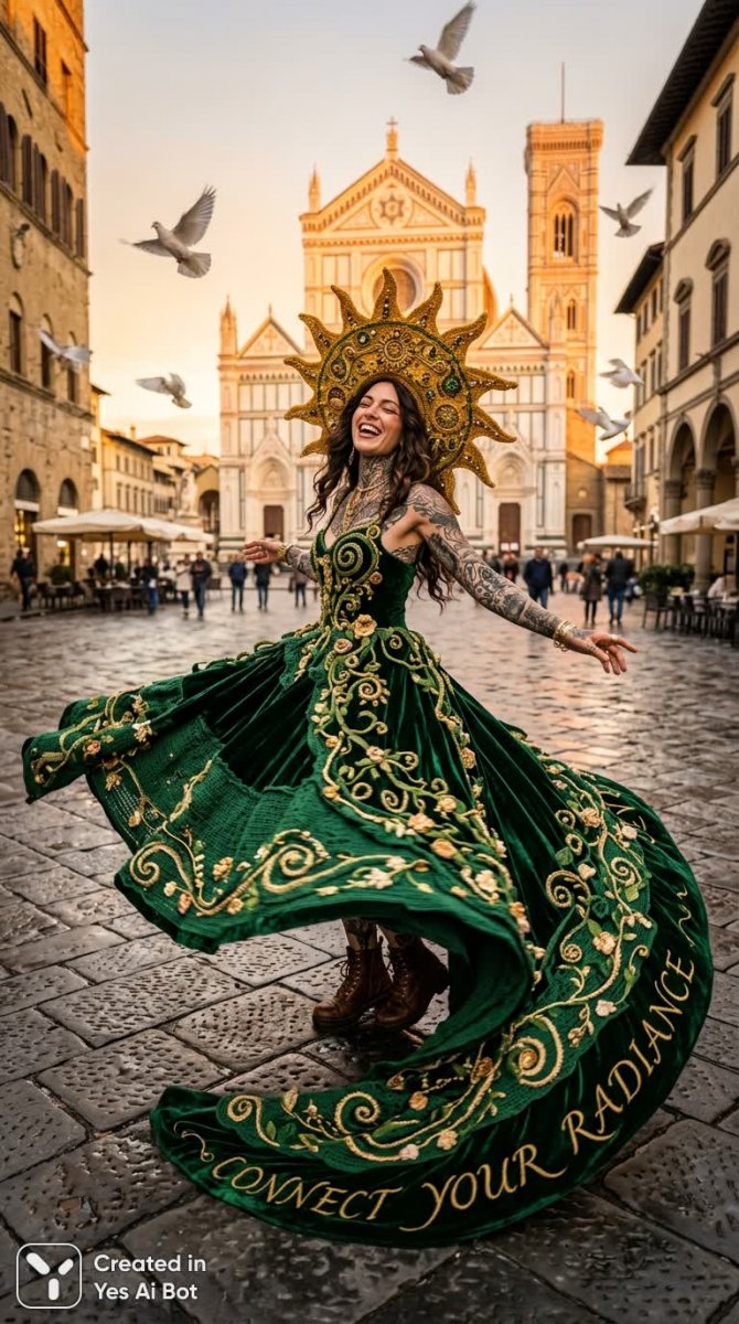 stylish, tattooed woman spinning in cobblestone plaza, regal dramatic crocheted velvet-green ballgown layered with spiraling, flowering tendrils, extravagant sweeping trail, oversized sun-shaped crochet hat covered in solar motifs, flying doves, golden hour, "connect your radiance"