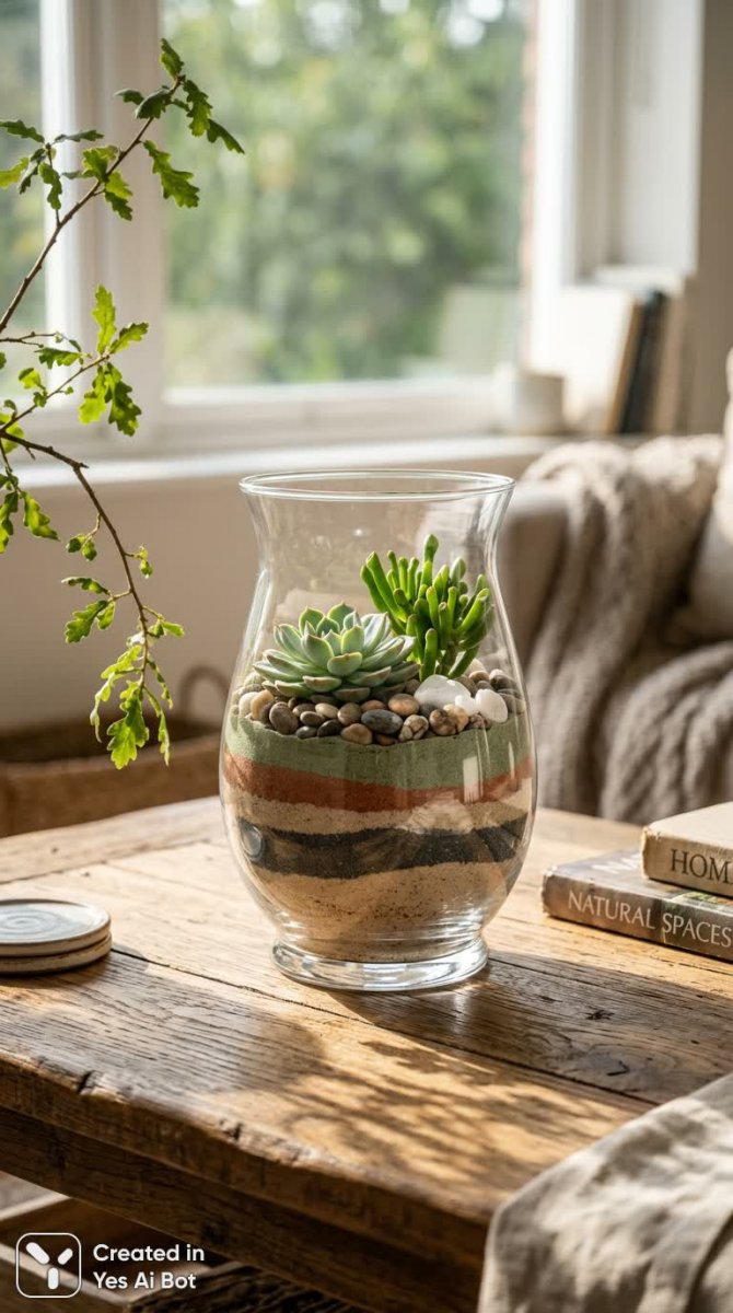 clear tulip-shaped vase, filled with censer sand and color layers, small green echeveria, bright crassula, round pebbles on white decorative stones, oak coffee table, sunlight spills from behind, shadow patterns, relaxed home atmosphere, dangling branch on left, artistic lens perspective, interior softness succeeded