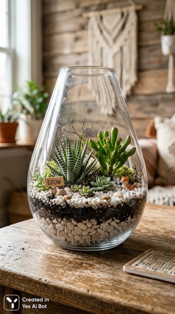 Миниатюрный сад суккулентов в стеклянной вазе: бохо-уют и дзен-настроение - Картинка, созданная ИИ Nano Banana