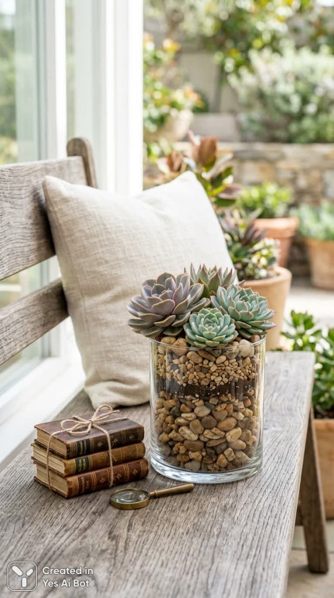 small glass cylindrical vase featuring layered decorative beige stones and echeveria succulents, bench display with miniature book arrangements alongside, creamy pillow just visible aft, full daylight illumination flows from side, contemporary chilling floristry look, styled plant composition