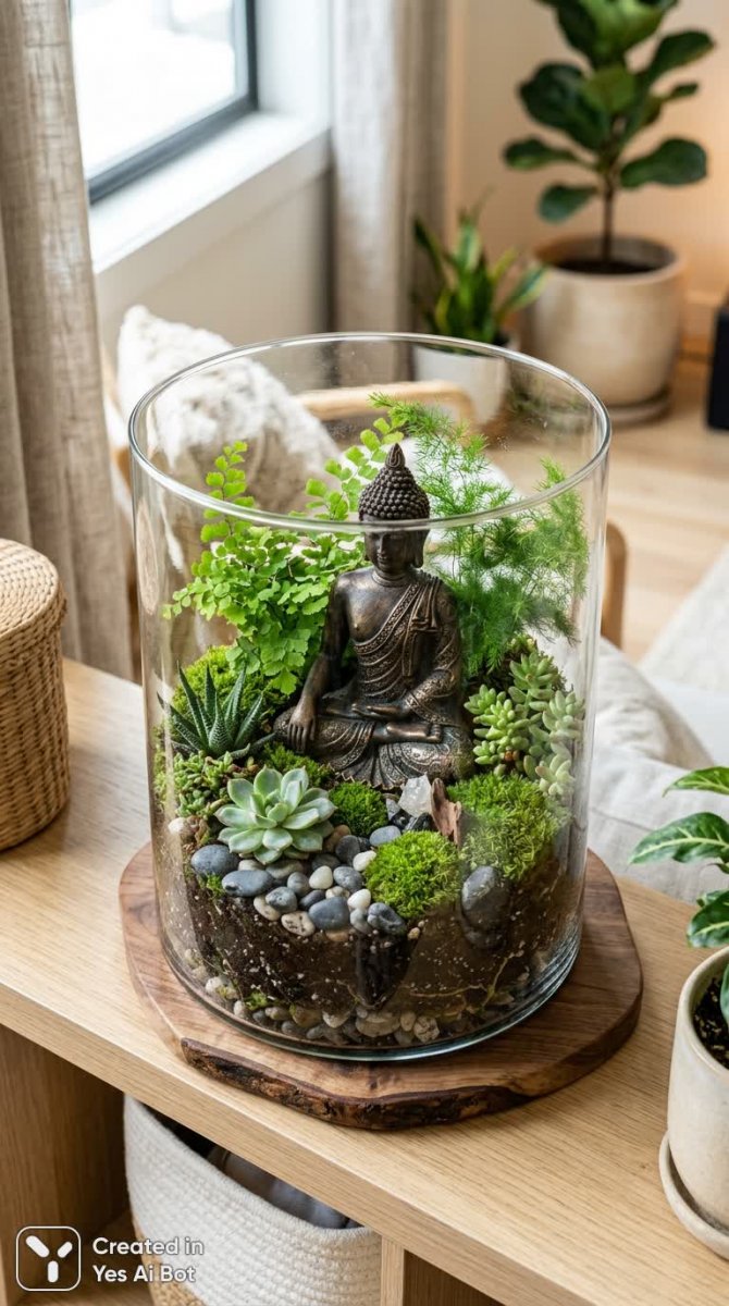 buddha statue, glass cylindrical vase with lush succulents and ferns, moss, gray and white stones details, creative zen style composition, eco modern home backdrop, sunlight top angle shot, macro photo, bg softly blurred minimalist living room