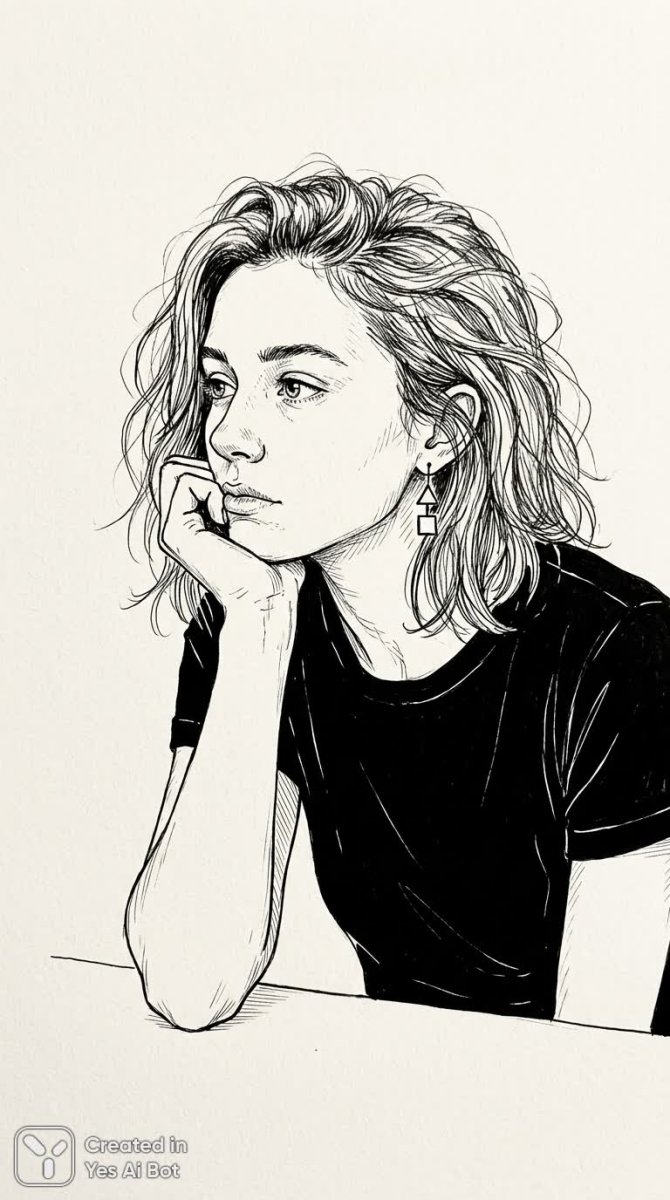 На изображении представлен минималистичный черно-белый эскиз молодой женщины, излучающей спокойствие и задумчивость. Она опирается подбородком на руку, что создает ощущение меланхолии и внутренней сосредоточенности. Её растрепанные волосы средней длины обрамляют лицо, подчеркивая естественность, а широко открытые глаза смотрят вдаль, словно устремленные в свои мысли или мечты. Детализированные геометрические серьги добавляют современный штрих к её простому повседневному наряду – футболке. Рисунок выполнен тушью с акцентом на тонкие линии, что придает графическую четкость и минимализм. Монохромная палитра усиливает ощущение простоты и элегантности, а однотонный белый фон позволяет полностью сосредоточиться на изображении, подчеркивая его чистоту. Это произведение искусства сочетает в себе утонченность линий и глубину эмоций, создавая завораживающий визуальный опыт, способствующий размышлениям о красоте момента и силе внутреннего мира. Каждая деталь тщательно продумана для передачи тонкого баланса между спокойствием и выразительностью, что делает эскиз настоящим произведением искусства в стиле минимализма, созданным нейросетью Nano Banana v.2.0 с использованием стилей реализма и детализации. Изображение было сгенерировано при помощи промпта, описывающего позу, внешность, одежду, технику исполнения и художественные особенности работы.