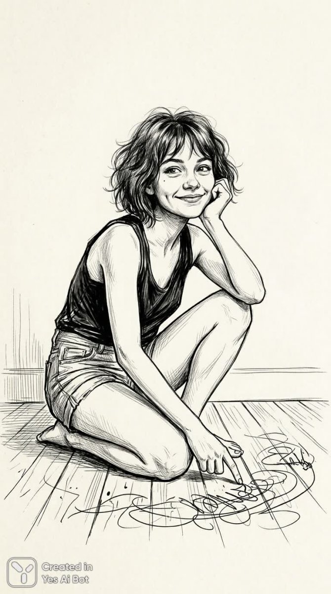Непринужденный набросок чернилами, выполненный в монохромной гамме, изображает девушку, расслабленно сидящую на полу. Ее непослушный боб приподнимается у щеки, подчеркивая открытую игривую улыбку. Фигура девушки облачена в шорты с высокой талией и топ, ее локоть опирается на колено, а вторая рука хаотично рисует неразборчивые узоры в воздухе. Рисунок выполнен тонкими линиями, что придает ему ощущение минимализма и простоты. Фон представляет собой однотонное белое пространство, акцентирующее внимание на фигуре девушки и ее движении. Энергия и легкость момента переданы через динамичные линии и непринужденную позу. Картина излучает беззаботность и спонтанность, словно запечатлев мимолетный момент вдохновения. Использование черно-белой палитры добавляет изображению графичности и акцентирует внимание на игре света и тени, создавая ощущение живого эскиза, выполненного от руки. В целом это визуально привлекательное изображение, которое передает чувство свободы и радости жизни через простые, но выразительные линии. Набросок словно зафиксировал момент творческого импульса, когда девушка позволяет себе быть спонтанной и наслаждаться моментом