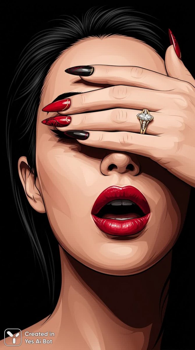 vector art minimalistic black bg, female face with open red lips, hand covering eyes, long red and black nails, elegant ring details, high contrast, perspective focuses on lips and nails, clean graphics