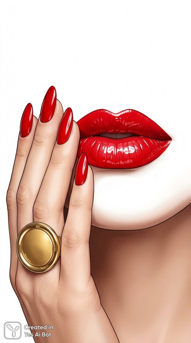 glossy red lips, white background, long manicured nails near bright red mouth, large circular ring, minimal detail, bold lipstick color, vector style graphic, artistic illustration
