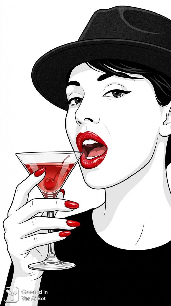 Современная графическая иллюстрация, выполненная в минималистичном стиле, представляет собой элегантный портрет девушки с акцентом на яркие детали. Фон – чистое белое пространство, подчеркивающее четкость линий и лаконичность композиции. Главные элементы привлекают внимание своей насыщенностью: ярко-красные губы и ногти создают контрастный акцент на фоне светлой кожи. Открытый рот придает изображению динамику и ощущение непосредственности. На голове девушки – стильная черная шляпа с текстурной поверхностью, добавляющая образу глубины. В руке она держит коктейль, что намекает на атмосферу расслабленности и удовольствия. Вся иллюстрация выдержана в духе современного графического дизайна, где простота форм сочетается с выразительностью деталей. Фокус внимания смещен на губы и ногти, что делает их центральным элементом повествования и подчеркивает утонченный вкус героини. Использование векторной графики обеспечивает четкость и масштабируемость изображения, делая его идеальным для различных целей – от рекламных материалов до оформления веб-сайтов. Общий тон изображения – уверенный, стильный и немного загадочный, отражающий современную эстетику минимализма