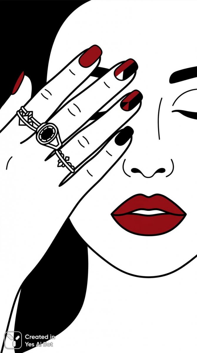 Изящный минималистичный векторный портрет прекрасной женщины. В центре внимания – рука с элегантными кольцами, бережно прикрывающая один глаз, создавая ощущение загадочности и утонченности. Яркий акцент на губах подчеркнут насыщенным красным цветом помады, а идеально подобранный красный и черный маникюр добавляет образу дерзости и современности. Фон выполнен в белом цвете, обеспечивая максимальный контраст и позволяя деталям изображения максимально выделяться. Стиль иллюстрации – плоский, с четкими линиями и лаконичными формами, характерными для современного дизайна. Особое внимание уделено изображению пальцев и губ, делая их фокусом композиции и акцентом на женственности и изысканности. Эта работа идеально подойдет для использования в качестве графического элемента в различных проектах, где требуется элегантность, минимализм и современный подход к визуальному представлению женской красоты. Иллюстрация обладает высокой детализацией при сохранении простоты формы что делает ее универсальной и легко адаптируемой к различным масштабам и носителям. Она воплощает собой сочетание изысканности и силы, загадочности и уверенности в себе – качества, которые всегда привлекали внимание зрителя