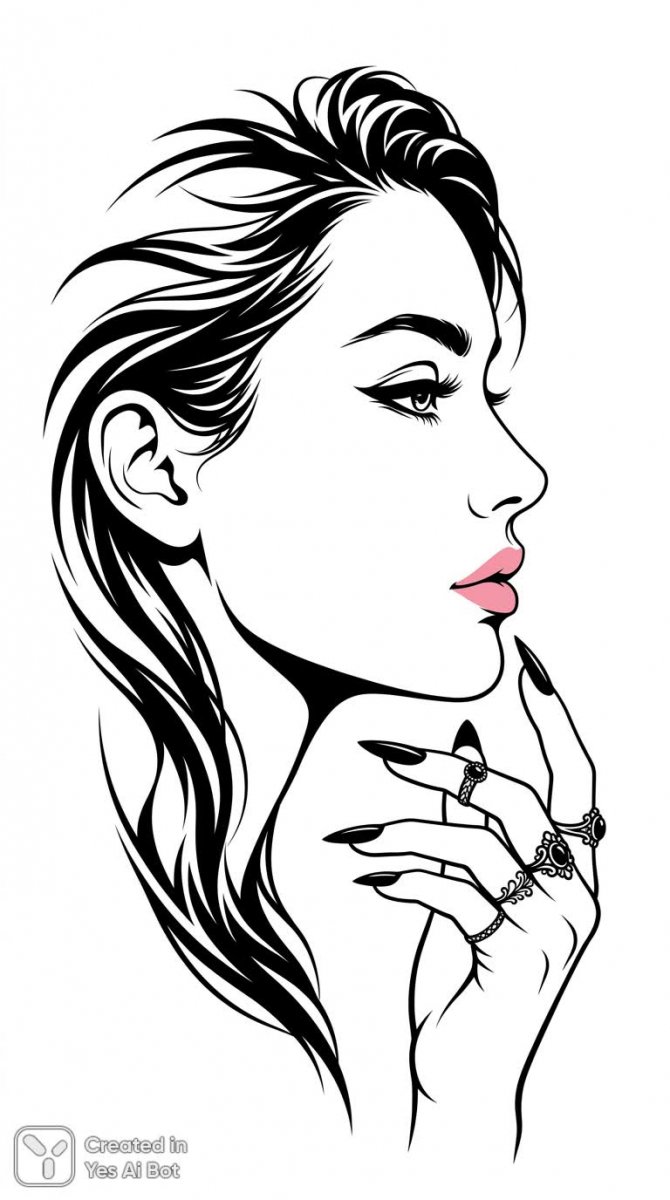 Изящный минимализм воплощен в этой графической работе. Абстрактные вертикальные полосы черного и белого создают динамичный фон для элегантного женского портрета. Лицо изображено в профиль, подчеркивая утонченные черты и загадочность образа. Акцент на губах нежно-розового оттенка притягивает взгляд, а изящные пальцы с кольцами и выразительным маникюром добавляют нотку роскоши и индивидуальности. Белый фон обеспечивает чистоту и ясность композиции, позволяя деталям гармонично выделяться. Четкие линии и резкий графический стиль придают работе современный и лаконичный вид, воплощая эстетику минимализма в каждой детали. Это визуальное исследование баланса между простотой и сложностью, создающее ощущение спокойствия и утонченности. Вся композиция пронизана ощущением изысканной элегантности и графической точности, что делает ее привлекательной для ценителей современного искусства и дизайна. Использование ограниченной цветовой палитры усиливает эффект минимализма, фокусируя внимание на форме и текстуре. Каждое кольцо на пальцах, каждый штрих в изображении лица продуманы до мелочей, создавая целостный и гармоничный образ, передающий ощущение уверенности и стиля. Это произведение – ода красоте в простоте и силе графического выражения