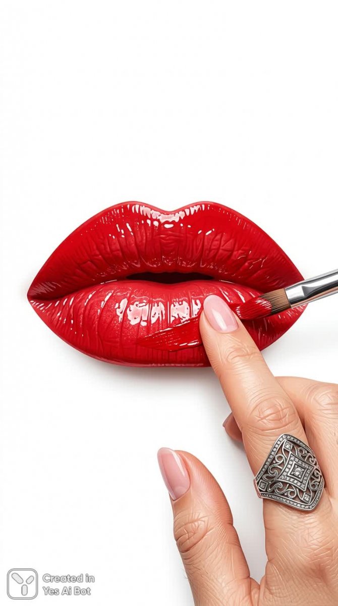 large shiny red lips focal point, finger with stripe pattern ring painting lips, stylish minimalist aesthetic, pop art impression, white bg, vector artwork.