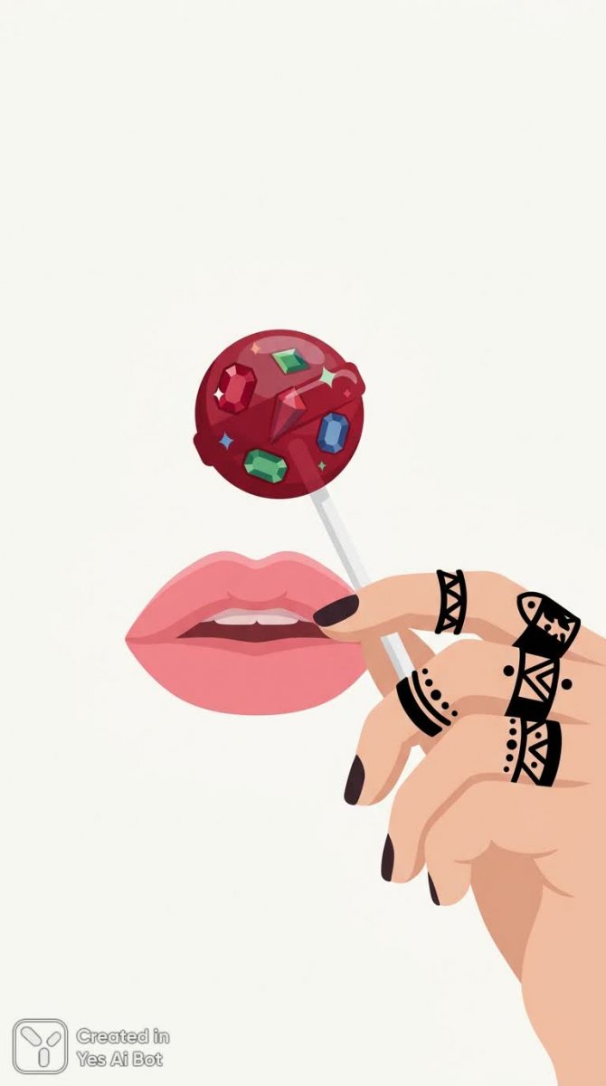 Изящная иллюстрация в стиле минимализма демонстрирует женственный образ с акцентом на детали и игру цвета. В центре внимания – чувственные губы нежного розового оттенка и изящные белые пальцы, украшенные выразительными кольцами с графичным черным узором. Открытый рот намекает на беззаботность и легкость, а в руке элегантно покоится леденец, инкрустированный драгоценными камнями. Фон отсутствует, что позволяет полностью сосредоточиться на красоте композиции и четких линиях векторной графики. Стиль исполнения – плоская иллюстрация, характерная для современного дизайна, подчеркивающая простоту и лаконичность. Вся работа пронизана женской энергетикой и нежностью, где каждый элемент тщательно подобран для создания гармоничного визуального образа. Акцент на цветовой палитре создает ощущение воздушности и легкости, а минималистичный подход позволяет зрителю насладиться красотой деталей, от блеска леденца до текстуры кольца. Иллюстрация воплощает собой современную эстетику, где простота форм сочетается с изысканностью и чувственностью. Это не просто изображение – это визуальная поэзия о женственности, элегантности и радости жизни, представленная в лаконичной и запоминающейся форме. Внимание к деталям и продуманная цветовая гамма создают эффектное и стильное произведение искусства, идеально подходящее для различных дизайнерских проектов