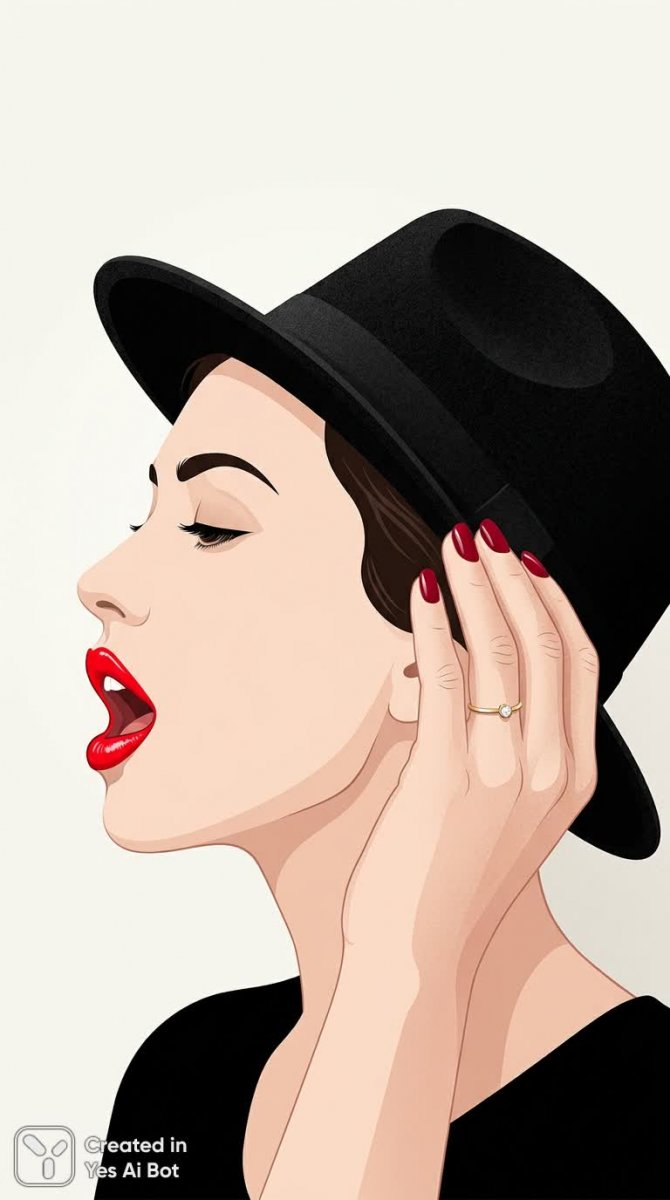 Изящный женский портрет в стиле минималистичного векторного искусства представляет собой элегантную графическую силуэт. Вид в профиль акцентирует внимание на плавных линиях лица и выразительной форме губ, подчеркнутых легким выделением. Яркий алый оттенок раскрытого рта добавляет образу динамизма и чувственности, создавая эффект неожиданности на фоне спокойного светлого фона. Рука с аккуратными полосатыми ногтями нежно удерживает край черной шляпы, придавая композиции нотку загадочности и утонченности. Белоснежная кожа лица контрастирует с темным цветом шляпы, усиливая визуальный эффект. На изящном пальце заметно элегантное кольцо, завершающее образ и добавляющее детализации. Вся композиция выполнена в современном стиле, характеризующемся простотой форм и отсутствием лишних деталей. Плоская графика создает ощущение легкости и воздушности, а минимализм подчеркивает красоту линий и пропорций лица. Изображение излучает элегантность и современный шик, представляя собой стильный графический элемент для различных дизайнерских проектов. В целом, это лаконичное, но выразительное изображение, способное привлечь внимание своей утонченной эстетикой и гармоничным сочетанием цветов