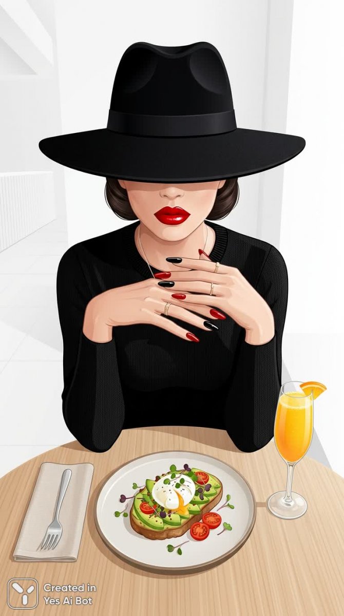 Изысканный портрет в стиле минимализма, выполненный с акцентом на четкие линии и лаконичность. В центре внимания – смелые губы, привлекающие взгляд своей выразительностью, и длинные ногти, покрытые глянцевым маникюром насыщенных оттенков красного и черного, символизирующих элегантность и уверенность. Черная шляпа загадочно скрывает глаза, добавляя образу пикантности и некоторой отстраненности. Ракурс снят сверху, что позволяет оценить всю композицию сцены: это стильный бранч в исполнении векторной графики с плоским дизайном. Яркие элементы деликатно разбросаны по всему изображению, создавая ощущение роскоши и утонченного вкуса. Фон выполнен в белоснежных тонах, подчеркивая чистоту линий и минималистичный подход к оформлению. Вся картина дышит элегантностью и современностью, представляя собой идеальное сочетание простоты и изысканности. Она словно приглашает зрителя окунуться в атмосферу спокойствия, роскоши и безупречного стиля. Этот арт-объект идеально подойдет для оформления интерьера или использования в качестве иллюстрации к тематическим материалам о моде, красоте и стиле жизни. Использование векторной графики обеспечивает четкость изображения и возможность масштабирования без потери качества, что делает его универсальным решением для различных целей