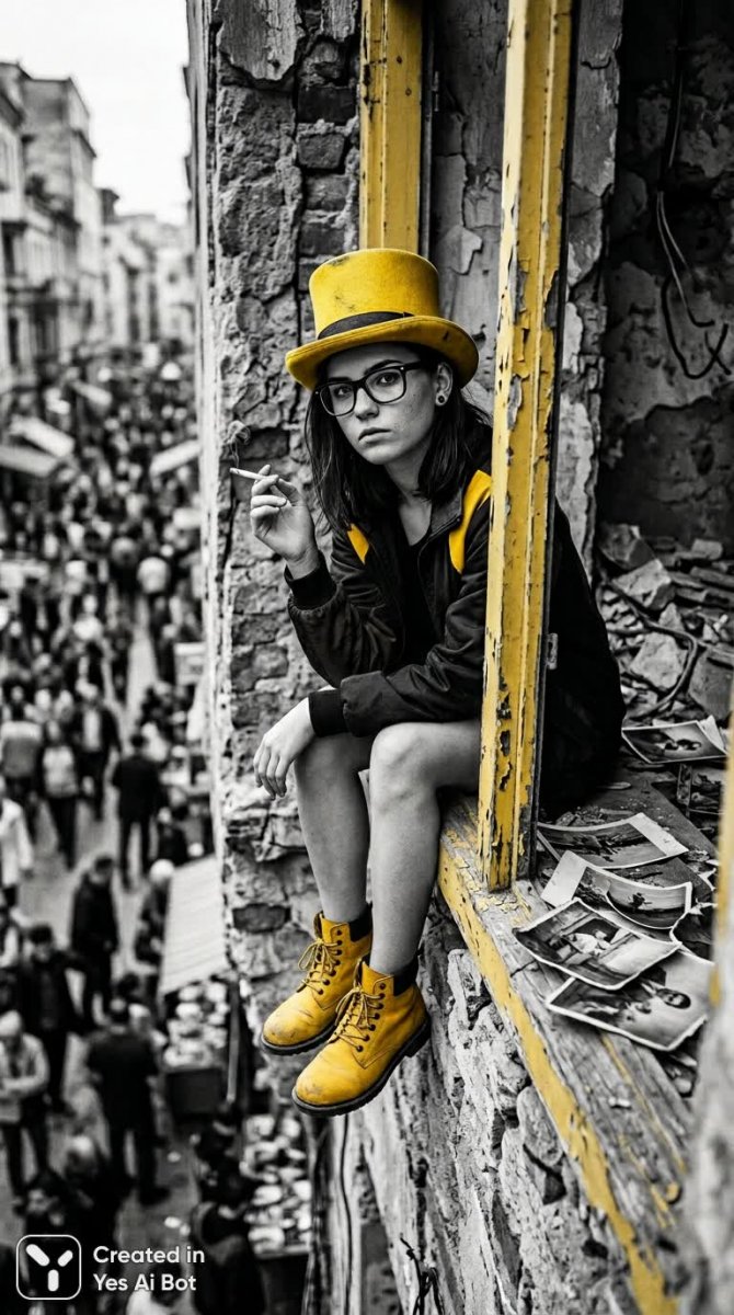 Завораживающий черно-белый снимок переносит в мир сюрреалистической современности. В центре композиции – девушка с загадочным выражением лица, облаченная в яркую желтую шляпу и стильные черные очки. Она невозмутимо держит сигарету, грациозно расположившись на фоне ослепительно-желтой дверной рамы. На ногах у нее выделяются броские желтые туфли, добавляющие образу динамизма и контраста. За спиной девушки размывается панорама оживленного города, создавая ощущение суеты и хаоса. В заднем плане хаотично разбросаны старые фотографии – словно фрагменты ускользающей памяти или потерянных историй. На ее верхней одежде заметен смелый акцент в виде желтого цвета, подчеркивающего индивидуальность и стиль героини. Архитектурный контраст усиливается изображением разрушающейся стены, символизирующей хрупкость времени и неизбежность перемен. Общая атмосфера снимка пропитана ощущением беспорядка и непредсказуемости, создавая завораживающий эффект погружения в альтернативную реальность. Это визуальное повествование о столкновении реальности и фантазии, о мимолетности момента и вечной красоте абсурда. Картина излучает ауру таинственности и провоцирует на размышления о природе человеческого существования в быстро меняющемся мире